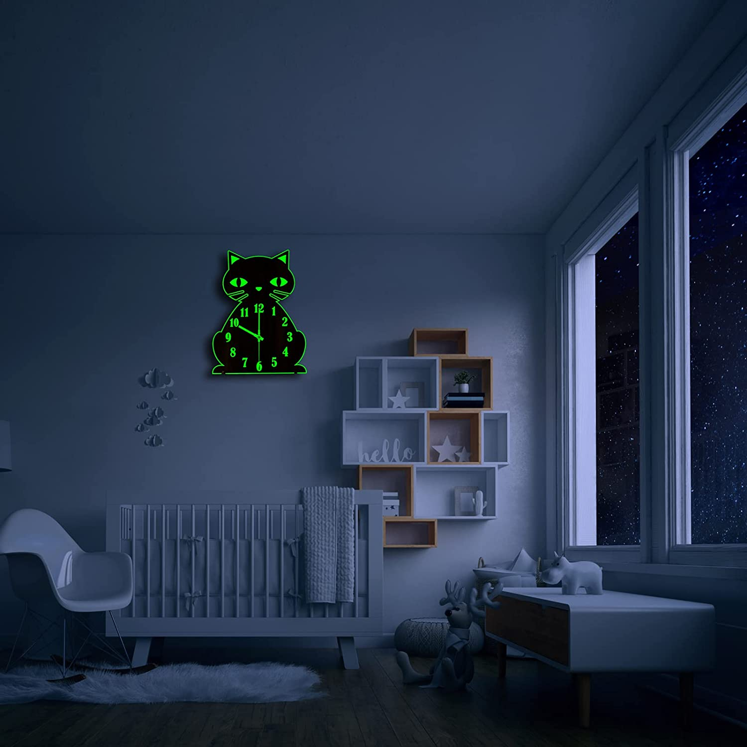 Wall Clock Glow in The Dark - Night Light Cat Clock Silent Non-Ticking Kids Clock for Bedroom Kitchen Classroom Decor,Cute Funny Gifts,12 Inch Brown [Night Light] - The wooden wall clock can absorb light energy at day and glow in the dark. The glow time depends on the light absorbed in the day. The more the absorbed light source, the longer the intensity and duration of the night light. [Cute Cartoon Style] - With cat theme, blessing function of night light,the cat clock can be used as a nice room decoration, suitable for kids bedroom,living room, study room, bedroom, kitchen, office, etc. [Wooden Wall Clock] - It's made of special brown MDF (Medium Density Fiberboard) material, metal pointers,no glass,no frame.It's simple and elegant clock. [Easy to Read ] - 12 Inch glow in the dark wall clock with large bold numbers make it easy to see from any corner of your room.Even the elderly or people with poor eyesight can see very well. [Non-ticking & Silent] - Precise quartz sweep movement guarantees accurate time and absolutely silent environment. [Nice GIft] - Lovely shape, glow in the dark / luminous , bring convenience to your life,it's nice gift for cat lover,friends,family,elderly,children etc.You can send your sincere wishes and greetings to your friends' birthday parties, company celebrations, Christmas, Mother's Day, Father's Day, etc Product Description Note The glow time depends on the light absorbed under the light source. The longer and stronger of light source absorbed, the longer the luminous durationand the greater the intensity. We advise to let the wall clock absorb light energy (sunshine or fluorescent lamp) more than 2 hour before installation .