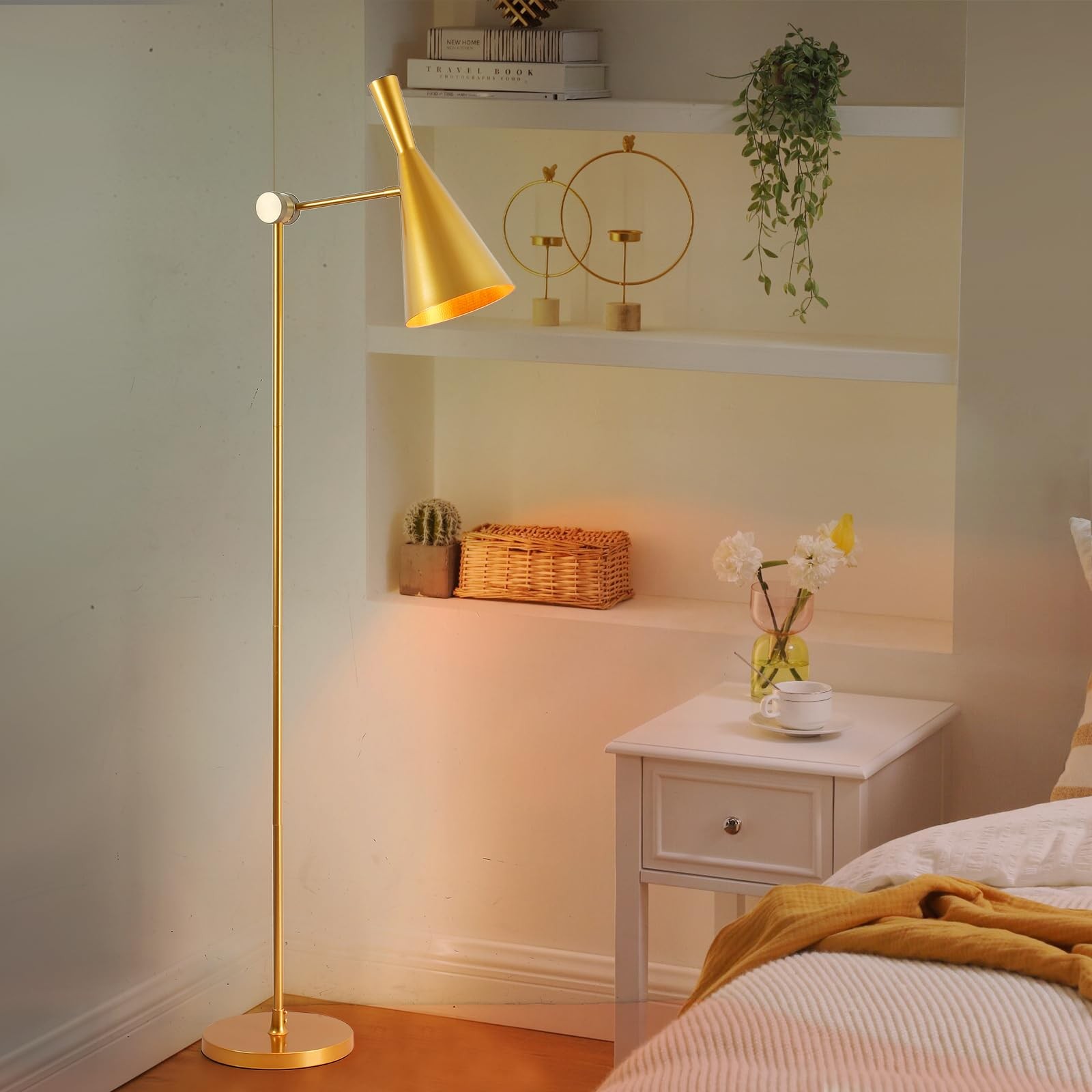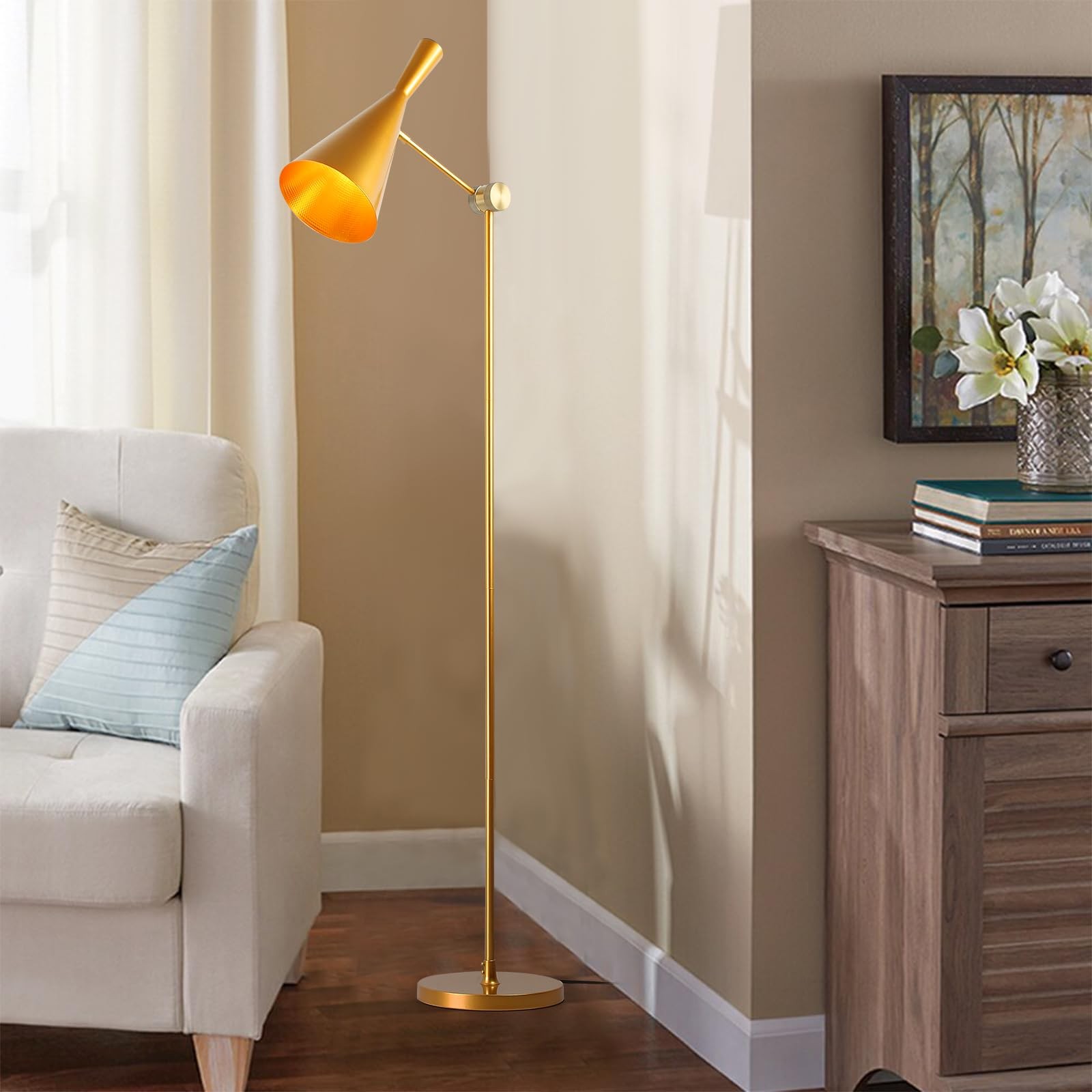 This metal floor lamp with gold lamp spotlight head will add warmness and sweetness to your room, making your room lively. Also can be a great gift,perfect for your friends or family who likes industrial lighting and interesting home or office decor. Makes an ideal housewarming, Father's Day, Mother's Day, Birthday,or anytime present. *Material: Metal *Overall Height:67”/170cm *Color: Golden brass *Lamp holder: E26 *Maximum wattage: 60W max *Voltage: 110V-120V *Light bulb: Edison bulbs/incandescent/energy-saving lamp/LED (not including bulb) 【Industrial Floor Lamp】: This metal adjustable floor lamp features a sturdy metal lamp body with stable metal stand. The versatile design making it the perfect addition to your living room, family room, bedroom, dorm room, home office, craft room. 【Up Down Adjustable】: Gold floor lamp is as easily adjustable lampshade in up or down that you'll love having. The overall height is 67 inches, much taller than others floor lamps. Being a deeply rooted mid-century floor lamp, which can be freely adjusted to lighting angle your favourite spot. Adds a natural simplicity to your room with the floor lamp. 【Easy to Assemble】: The floor lamps with the each components and detailed introduction of assemble. Part of the cord is hidden on the middle straight iron, which solves the trouble of ugly and annoying wires mucking up the beautiful compositions in your room. Easy assembly steps make you finish the installation in a flash even without the help from a professional electrician. 【Suit for Any Room】: The Metal floor lamp will work as a modern decoration for your living room or additional lighting in the bedroom. Perfect as lighting in the living room while watching TV, in the office while reading a book or in the dining room giving sensual light during a romantic dinner. 【Satisfaction Guaranteed Warranty】: To give you a perfect shopping experience, we offer excellent after-sale service. If for any reason you are not satisfied with your purchase, please contact us because our number one goal is customer satisfaction and we are committed to making it right for you.