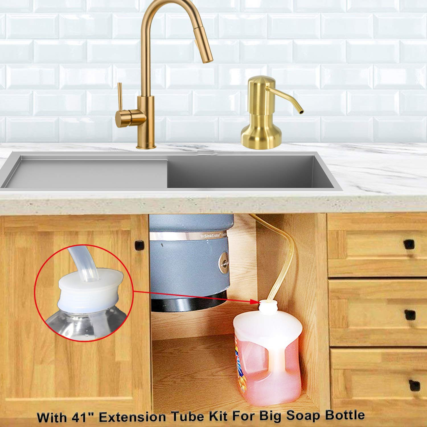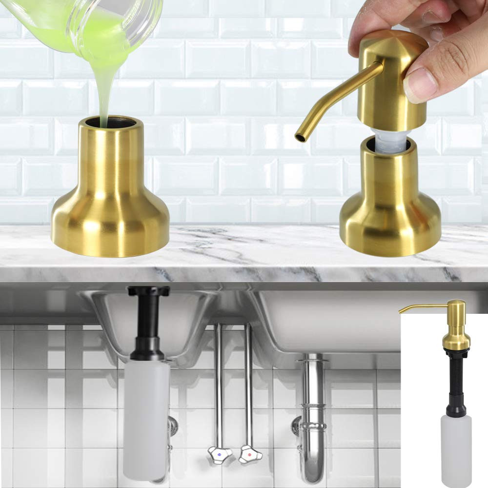 ☞ HIGH QUALITY MATERIAL - The kitchen sink soap dispenser is made of stainless steel and internally lead-free ABS, Surface brushed nickel glaze treatment, resistant corrosion & rust. Extended 3-inch nozzleto (full 360 degrees rotates) prevent splashing of soap. Aerodynamic principle make the pump is easy to push that could better to control the amount of the soap. self-priming and won't get stuck and drip. Perfect for kitchen, bathroom, commercial and business. ☞INSTALLTION WAYS - The chrome stainless steel soap dispenser come with 17 oz large volume bottle and 47" extended tube attachment so you don't have to refill all the time. Without disassembling, refill soap from the in sink soap dispenser pump head. Soap Dispenser for Kitchen Sink can be used in a variety of ways whether you want to fill it up with hand soap, dish soap, liquid detergent or even hand lotion. ☞ SOAP DISPENSER WITH EXTENSION TUBE - The chrome stainless steel sink soap dispenser with 47" extended tube let u don't have to refill the soap frequently any more, put extended tube directly into big soap containers. Built in check valve make soap always filled tube and end of extended tube is always at the bottom of the bottle. so you don't waste time on pumping. Comes with 2 multi-sized rubber caps fits all soap container bottle opening. ☞ LONG THREADED TUBE - The kitchen sink soap dispenser with Lengthen and thicken 3.5 inches threaded tube fits most countertops(Granite, Stainless Steel, Wood), durablity and not easy to break. With rubber washers on both sides u don't have to worry about countertop water leaking through. It also can be for bathroom sink, laundry soap pump or RV sink soap dispenser, fill it up with hand soap, dish soap, liquid soap, lotion. ☞ 10YEARS - We offer 10 years and 3 months no questions asked . What are you still waiting for? This kitchen sink soap dispenser will be the best choice for you. click the "add to cart button" at the page to order your set now! enjoy the excellent shopping experience. any problem, pls us for or .