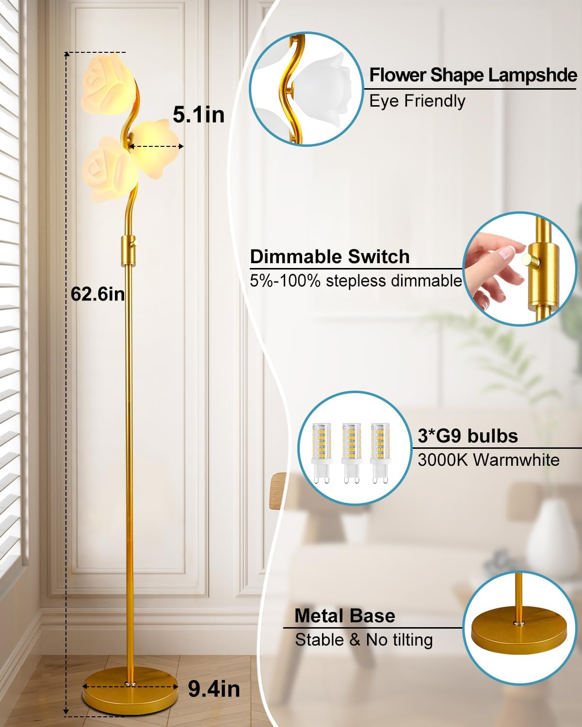 Store New Arrivals Add to Favorite View Feedback Contact Gold Flower Floor Lamp Stepless Dimmable Modern Mid Century Standing Lamp Floral 3-Light Floor Lamps with 3000K G9 Bulbs Sturdy Metal Base Tall Lamps for Living Room Bedroom Home Office Description Item model number LFLL Light Source Type LED Style Cottage Number of Items 1 Power Source Corded Electric Number of Light Sources 3 Country of Origin China Switch Type Dimmer Batteries Included? No Lighting Method Uplight & Downlight Mounting Type Floor Mount Lamp Type Floor Lamp Cartoon Character Floral Room Type Office, Living Room, Bedroom, Study Room, Dining Room Assembly Required Yes Installation Type Freestanding Product Dimensions 9.4"D x 9.4"W x 63"H Material Metal Efficiency Energy-efficient Finish Type Brass Specific Uses For Product Indoor use only Is Waterproof False Indoor/Outdoor Usage Indoor Brightness 1800 Lumen Control Method Touch Water Resistance Level Not Water Resistant Batteries Required? No Item Weight 9 Pounds Connectivity Protocol Homeplug Special Features Corded Special Feature Corded Shade Height 57 Inches Part Number LFLL Shade Color White Color Temperature 3000 Kelvin Color 3 Flower-Gold Wattage 24.00 Is Cordless? No Base Material Metal Bulb Base G9 Shape S-shaped and straight Voltage 110 Volts Recommended Uses For Product Reading Shade Material Plastic Finish types Brass Included Components Bulb Size 3 Flower-Gold Stepless Dimmable & 3PCS G9 Bulbs Included✨ The mid century floor lamp is dimmbale, Adjust brightness from 0% to 100% with a smooth rotary knob—ideal for movie nights, reading, or creating ambient lighting. This standing lamp comes with 3PCS 6W premium G9 bulbs (3000K warm white) for brighter, evenly distributed light, offering long-term versatility. Soft & Eye-Friendly Illumination🖼️ This Frosted PC lamp shades floor lamp diffuses soft, non-glare 3000K warm light, protecting eyes even during prolonged use. The gentle light through its natural PC lamp shade, creating a cozy ambiance perfect for living rooms or bedrooms. Ultra-Stable & Child/Pet-Safe Design🛡️ The modern floor lamp designed of 60” tall metal pole with a weighted base prevents tipping, while heat-resistant materials ensure safety. Perfect for homes with active kids or pets—no sharp edges or overheating risks. Unique Floral Lamp Shade Design🎁 This cute floor lamp not only used for liughting, but also features three pc shades creating a playful "flower" theme. Standing tall like a plant's stem, this funky floor lamp evokes nature indoors. Its S-shaped pole makes it a stunning floral lamp and retro decor. Ideal as a floor lamp for reading or a lamp for a bedroom standing floor 3-Minute Assembly & 5-Year Support🔧 No tools needed installation with clear instructions. A girl can complete the assembly in just 3 minutes. Backed by our 5-year quality promise and 24/7 customer support for no worry ownership. Product Description Dimmable Flower Floor Lamp - Make Your Sweet Home This floor lamp is dimmable, You can turn the dimmer knob to set any brightness as you like according to different scene needs. With a minimalist look, it can perfectly match with any industrial, modern minimalist room decor, adding a warm atmosphere to your living room, bedroom etc. Dimmable Floor Lamp 15%-25% Brightness: Best for sleeping, meditation or storytelling. 50%-70% Brightness: Best for watching movie, playing electronics . 100% Brightness: Best for studying, reading, working or entertainment. Eye Caring Sturdy Floor Lamp For Living Room This flower floor lamp can be matched with any decor style to add a sense of fashion to your home For Bedroom The floor lamp emits a 3000K warm white light, providing sufficient lighting for your office. For Home Office Soft lighting creates a warm ambiance, making you feel relaxed and comfortable in your own space. 1 For Living Room 2 For Bedroom 3 For Home Office Mid Century Modern Floor Lamp Add to Cart Add to Cart Add to Cart Add to Cart Add to Cart Add to Cart Add to Cart Customer Reviews 4.6 out of 5 stars 43 4.4 out of 5 stars 48 4.4 out of 5 stars 48 4.2 out of 5 stars 56 4.4 out of 5 stars 48 4.2 out of 5 stars 87 4.5 out of 5 stars 18 Price $66.49 $ 66 . 49 $69.99 $ 69 . 99 $69.99 $ 69 . 99 $59.90 $ 59 . 90 $59.99 $ 59 . 99 $59.99 $ 59 . 99 $59.99 $ 59 . 99 Color Gold Black White Gold Black White Pink Height 64IN 64IN 64IN 60IN 60IN 60IN 60IN Dimmable ✔ ✔ ✔ ✔ ✔ ✔ ✔ Bulbs Includded ✔ ✔ ✔ ✔ ✔ ✔ ✔ Style Mid Century Modern Mid Century Modern Mid Century Modern Mid Century Modern Mid Century Modern Mid Century Modern Mid Century Modern ABOUT US We’re dedicated to bringing you great deals on quality products. From home décor and garden essentials to tools, hardware, and pet accessories, our store has something for everyone — all at prices you’ll love. SHIPPING We ship all orders directly from the USA for fast, reliable delivery. Most items ship within 1 business day and include free shipping to the lower 48 states. For international orders, we use eBay’s Global Shipping Program — simply continue checkout to see costs, duties, and taxes for your country. FREE RETURNS We offer a 30-Day Return Policy on items which you are not completely satisfied with. You have the option for a full-refund or an exchange of the item. CUSTOMER SATISFACTION We do everything we can to ensure every customer is 100% satisfied. If something isn’t right, just send us a message — we’ll make it right quickly!