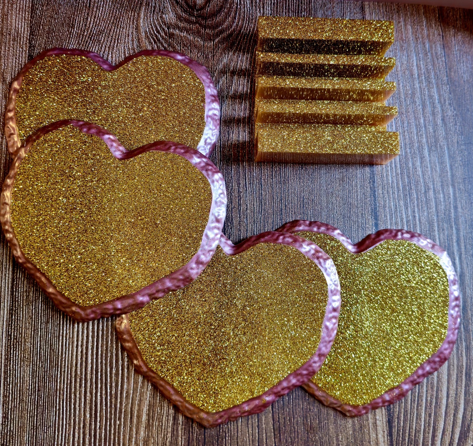 This set of gold glitter and rose gold heart-shaped handmade coasters is perfect for adding a touch of contemporary style to your home decor. Made of resin, these coasters feature a heart-shaped design with a gold color and a shiny finish. Set includes 5 coasters with a diameter of 5 inches and a set rack/holder for easy storage. Ideal for all occasions, these lightweight and stackable coasters are easy to clean and maintain, making them a practical and stylish addition to any space. Made in the United States.