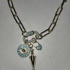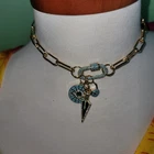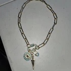 This Gold Paper Clip Crystal Carabiner Charm Necklace features an oval carabiner closure adorned with Aruba Blue Turquoise crystal charms. The necklace is 16 inches in length and made of brass plated metal. The unique design includes a stackable paper clip chain and is suitable for both men and women. With a statement, charm, and choker style, this piece encompasses themes of beauty, biker culture, love, bohemian vibes, ethnic influences, and hip hop fashion. It is a bold and eye-catching accessory perfect for adding a touch of personality to any outfit. Charms as photographed, metal, crystal and enamel. Brass gold plated. Please ask all questions prior to order. All sales are final. To open or close, spin barrel.