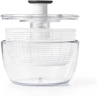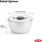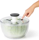 One-handed pump for maximum drying with minimum effort Patented brake stops basket immediately with a simple press Storage lock holds pump flush with lid for stacking and storing Non-skid base keeps the bowl stable during use Removable spinner basket works as a colander for rinsing greens Durable clear bowl doubles as a storage or serving bowl A new spin on our classic design Before the introduction of the OXO Good Grips Salad Spinner in 1998, crank or pull-tab salad spinners were considered high-end products. Some people even used the spin cycle of their washing machine to dry lettuce. Our easy-to-use Spinner transformed the tool into an everyday kitchen essential. Nearly 20 years later, we revisited the Spinner to make some updates while keeping the top features and original inspiration: a children’s top. With a modern design that complements contemporary kitchens and an improved brake that stops on a dime every time, we think you’ll love our new spin on the classic design. Dry salad greens with a simple press of the soft, non-slip knob. The non-slip base keeps the bowl steady on the countertop, and the updated built-in brake button stops the Salad Spinner for unloading. The basket doubles as a colander, and the lid comes apart for easy cleaning.