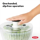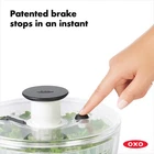 One-handed pump for maximum drying with minimum effort Patented brake stops basket immediately with a simple press Storage lock holds pump flush with lid for stacking and storing Non-skid base keeps the bowl stable during use Removable spinner basket works as a colander for rinsing greens Durable clear bowl doubles as a storage or serving bowl