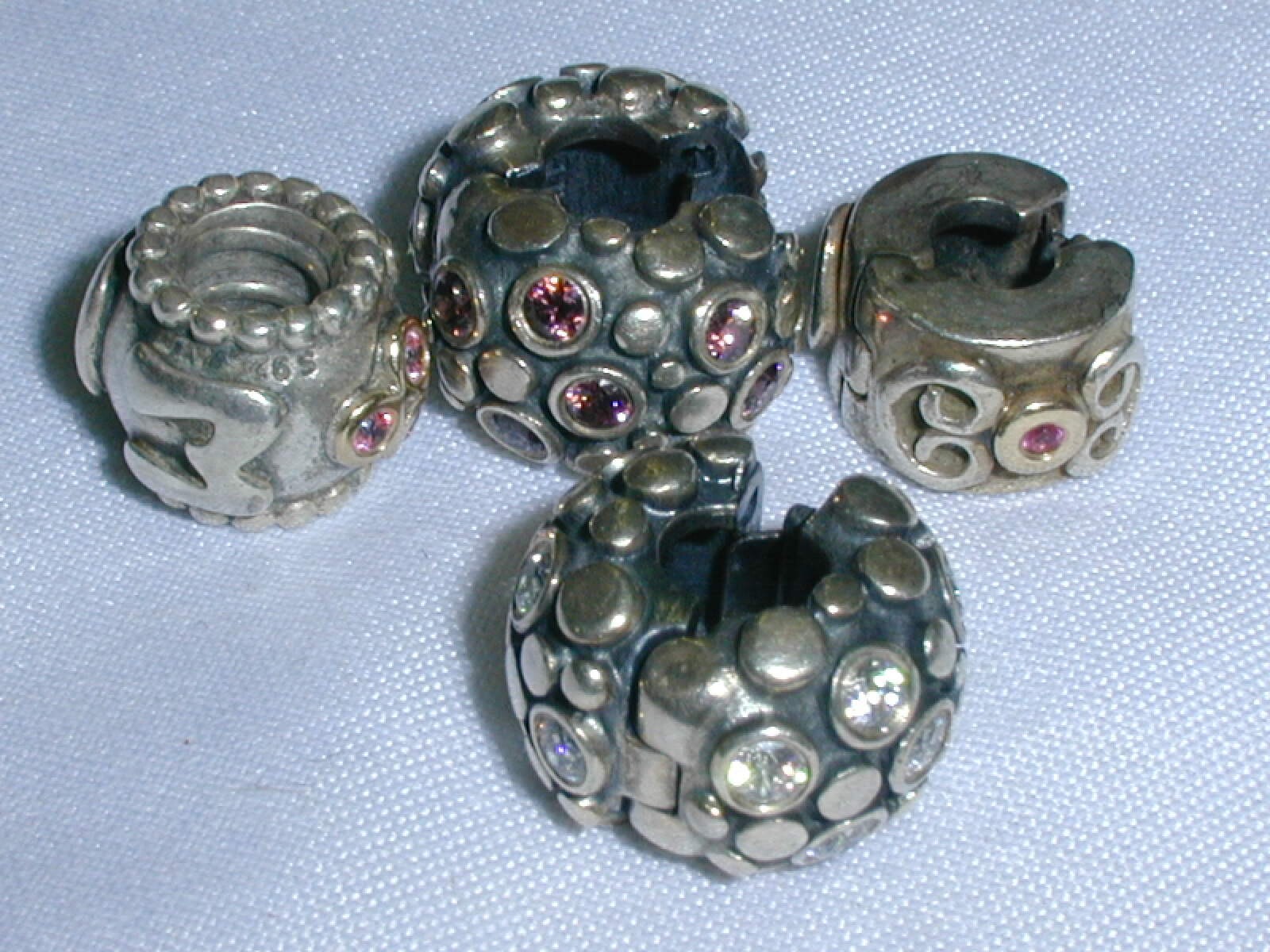 This is a great lot of four PANDORA charms, including three clip stoppers and one charm, with two of them featuring 14k gold accents. The charms are vintage and crafted from 925 silver with pink CZ stones. The style is classic PANDORA, perfect for adding to a charm bracelet or necklace. Ideal for those who appreciate high-quality fine jewelry with a touch of luxury, these charms would make a stylish addition to any collection. The one charm is MOM with 14K and pink cz's. The double heart clip has 14K and pink sapphires. The 2 larger clips have clear and pink stones- possibly topaz. DESCRIPTION: Hallmarked: 925 and 925S ALE Weight: 15 Grams Width: 3/8" They look Great on! Free First class shipping Domestic United States only, international shipping is available at actual first class rates. Please see my other listings for more great jewelry.