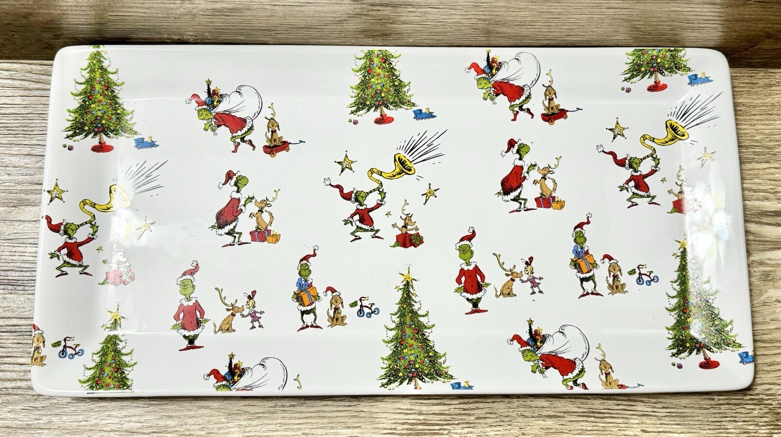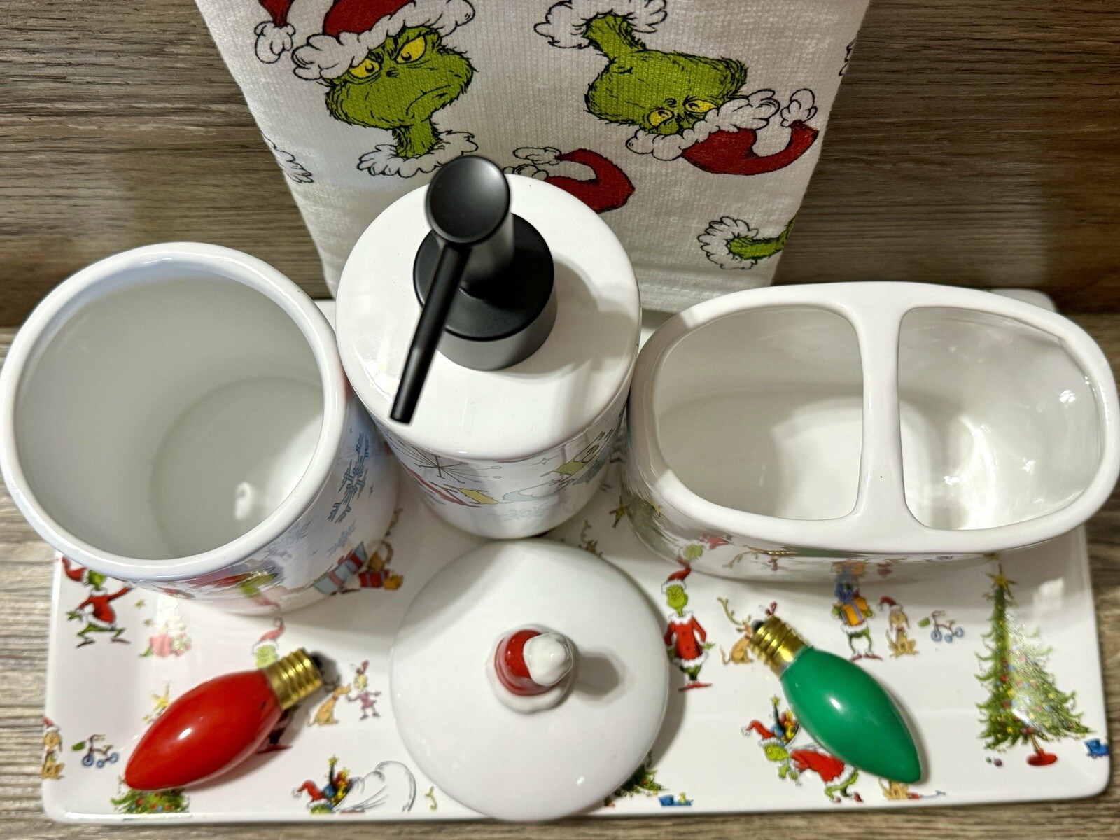 Grinch Soap Dispenser, Jar with lid, toothbrush holder, Tray, and hand towel. Perfect bathroom or Kitchen Christmas Decor. Light bulbs NOT included. This is the perfect addition for any Grinch Fan! It’s rare to find a whole set of Grinch accessories. Great Grinch ceramic decor to add to your Holiday decorations. Thanks for looking!