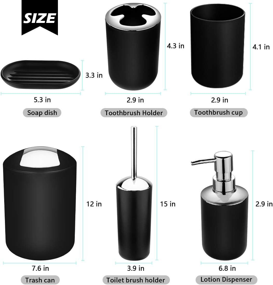 Set Includes :1 Soap Dispenser, 1 Toothbrush Holder, 1 Toothbrush Cup, 1 Soap Dish, 1 Toilet Brush Holder,1 Trash Can Elegant Design : take your bathroom decor to stylish new heights with this bathroom accessories set, very stunning and a great touch of extra elegance to the bathrooms, perfect for giving as a gift for housewarming or a wedding Fully Functional Completed Set : A completed bathroom accessory set which equips everything you will need to organize your toiletries. Toothbrush holder features 3 - holed openings, 2 small ones allow you to keep your toothbrushes and 1 larger hole to place slim toothpaste, making brushing teeth in one grab Durable And Amazing Quality : This 6-Piece Bathroom Accessory Set is made of durable plastic that can outlast competing products. It’s also ideal for kids' bath for its durability and not easy to break like ceramic set. Our high quality plastic bath accessories will resist to constant use, keeping their look just as elegant and new over time Premium Quality Liquid Soap Dispenser Pump : We know how frustrating it can be to use a flimsy pump that leaks or just does not work. No matter how your bathroom set looks like, a bad pump can ruin the experience. That’s why we included a hard plastic pump for the liquid soap dispenser in this set