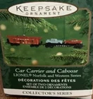 This Hallmark Keepsake miniature ornament set features a Lionel car carrier and caboose from the Norfolk Western collection. Made of diecast metal and measuring 3.25 inches in length. Box is in rough condition Please feel free to contact me with any questions you have