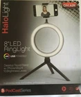 Halo Light Ring Light With Tripod Stand. Desktop Tripod Stand w/ phone mount. Condition is "New". 10 Brightness Levels. Get that professional glow in videos and photos right from your desktop with Halo. This 8" LED ring light comes with an adjustable tripod that 's designed for easy, tabletop use while saving space, and built-in smartphone mount for seamless recording convienience.