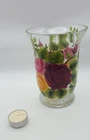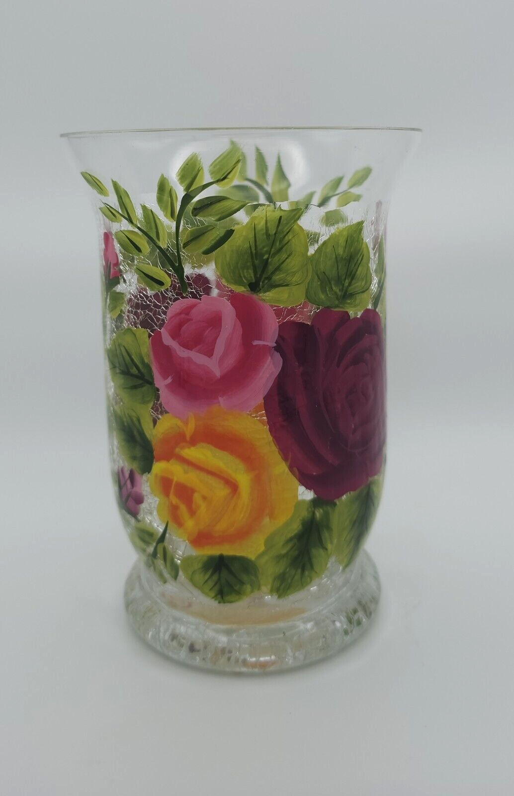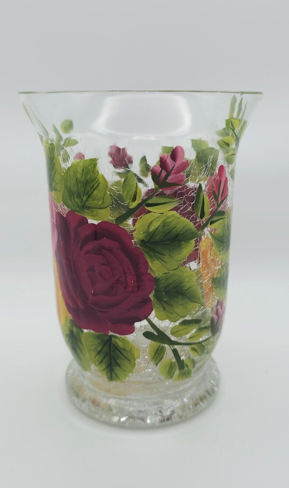 Add a touch of elegance to your home decor with this beautiful Fifth Avenue Crystal "Roses" 6-inch hurricane candle holder. The mouth blown glass has a crackle finish and is exquisitely adorned with hand painted roses in red, pink, and yellow. The original tealight and box are included. The box is in fair condition, but the hurricane candle holder is in excellent condition. MEASUREMENTS: Height: 6" Width around mouth of hurricane: 4 5/16" Width around base of hurricane: 3 1/4" WEIGHT: 13 oz. RECOMMENDED CARE: Handwash Only