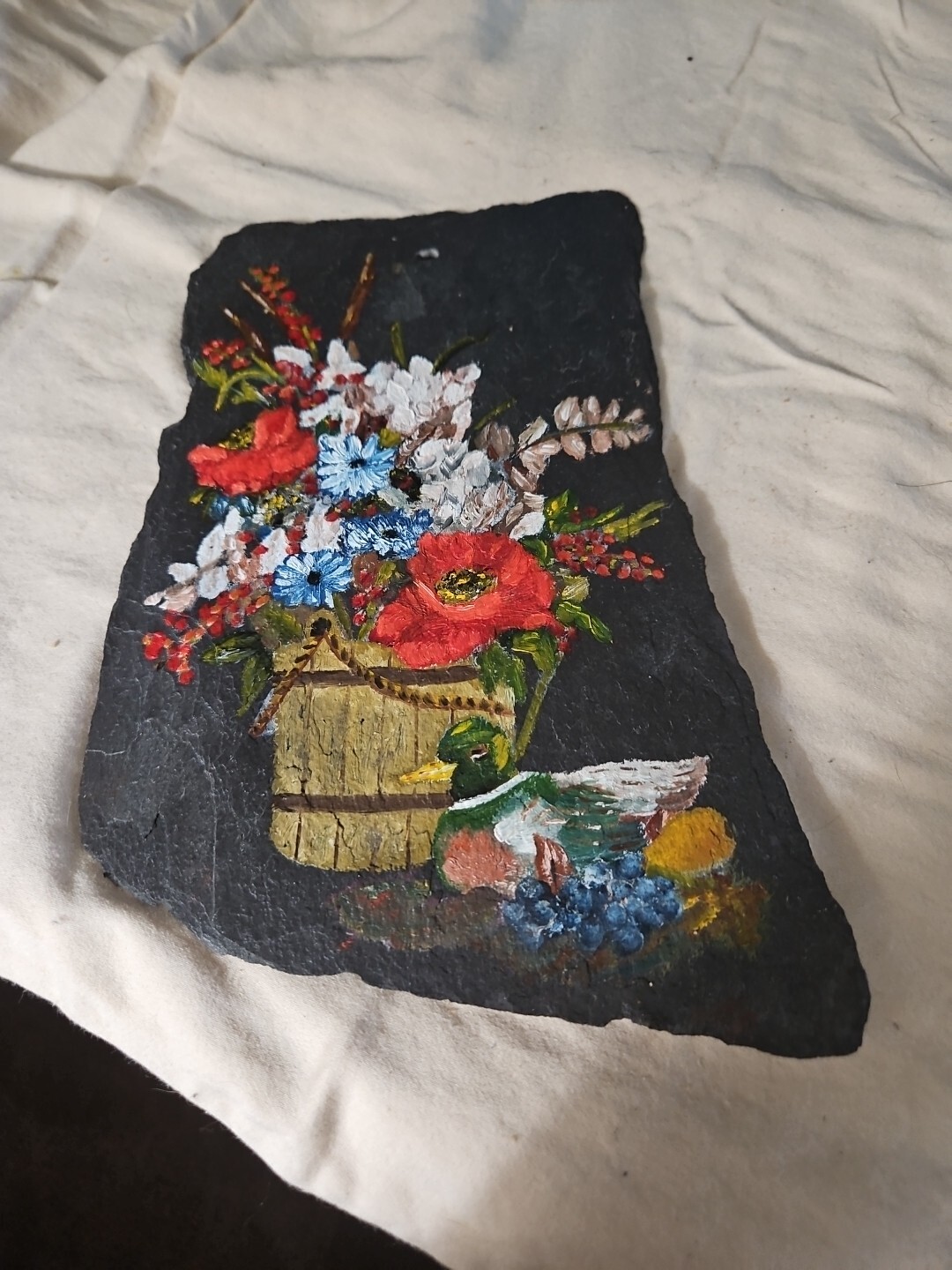 Decorative Hand Painted Small Slate Floral Trivet or wall hanging Vintage **Pre-Owned **Vintage **Type: Decorative Trivet **Design: Flowers **Hand Painted **Measurements: 8.5” Height…6” Length **THIS IS A HAND PAINTED VINTAGE PRE-OWNED SMALL SLATE TRIVET IN GOOD CONDITION…GENTLY USED**