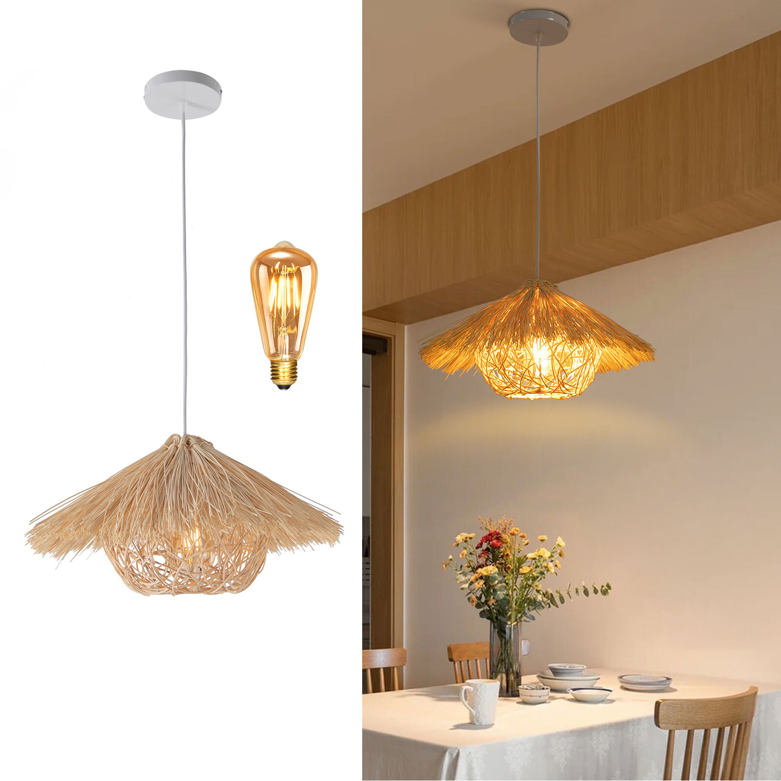 Application With a lighting area of 215.28-322.92 ft², it is suitable for flat and sloping ceilings in kitchens, living rooms, bedrooms, balconies, bars, aisles, foyers, hotels, restaurants, corridors, cafes, children's rooms, libraries, basements, clubs, and other indoor places. Specification Material: Rattan, Iron Process: Hand-Woven Color: Wood Color Style: Bohemian Assembly Required: Yes Indoor/Outdoor Usage: Indoor Mounting Type: Ceiling Mount Efficiency: E Light Source: 1* E26 Bulb(Not Included) Max. Bulb Power: 60W Voltage: 110V Lighting Area: 20-30m²/ 215.28-322.92 ft² Base Diameter: 12cm/ 4.72in Package Included 1* Chandelier All Accessories for Installation E26 Woven Pendant Light Hand-Woven Farmhouse Chandelier Ceiling Lamp Fixture USA Description This chandelier will not only bring light and warmth to your life but also add interest to your room. The hand-woven look complements the theme of the room and adds a beautiful visual effect to the room wherever it is placed. In addition, you can also adjust its height according to your actual needs and preferences. It is not only a light but also a beautiful decorative piece. Key Features Sturdy and Durable: This product is made of high-quality rattan and iron with a hand-woven process, which is environmentally friendly, non-toxic , stable, and durable. Unique Appearance: The hand-woven lampshade is simple in design and novel in appearance, and the light is projected on the ceiling through the lampshade to form a very beautiful pattern, making your room more romantic. Adjustable Height: You can adjust the height of the chandelier by adjusting the length of the hanging wire(3.94-39.37in) for different ceiling heights. Thoughtful Design: The semi-open shade not only allows light to diffuse and illuminate the space but also makes it easy to change the bulb. Meet Your Needs: Our product is available for dimmable bulbs(not included), and you can adjust the color of the light source to suit your needs. Easy to Install: With a simple structure and complete set of accessories, all you need to do is finish assembling the chandelier, then connect the pre-wired wires on the ceiling and screw the E26 bulb( not included ) into the lamp holder. Ideal Gift: This product is stylish and high-quality and can be used as an ideal housewarming, birthday, and holiday gift for parents, friends, and loved ones. Good Customer Service: We stand behind all our guests and look forward to assisting you with your purchase. It is our pleasure to answer your confusion and questions. The end of the story between us is not "we sell and you buy". Details E26 Lamp Head: The standard E26 lamp head is suitable for incandescent, halogen, LED bulbs, etc. for easy replacement. Solid Base: The large round base ( diameter: 4.72 in ) increases stress area, and can make the item fixed firm without falling easily. Application With a lighting area of 215.28-322.92 ft², it is suitable for flat and sloping ceilings in kitchens, living rooms, bedrooms, balconies, bars, aisles, foyers, hotels, restaurants, corridors, cafes, children's rooms, libraries, basements, clubs, and other indoor places. Specification Material: Rattan, Iron Process: Hand-Woven Color: Wood Color Style: Bohemian Assembly Required: Yes Indoor/Outdoor Usage: Indoor Mounting Type: Ceiling Mount Efficiency: E Light Source: 1* E26 Bulb(Not Included) Max. Bulb Power: 60W Voltage: 110V Lighting Area: 20-30m²/ 215.28-322.92 ft² Base Diameter: 12cm/ 4.72in Hanging Wire Length: 100cm/ 39.3in Adjustable Height Range: 10-100cm/ 3.94-39.37in Lampshade Diameter: 42cm/ 16.53in Lampshade Opening Diameter: 12cm/ 4.72in Lampshade Height: 20cm/ 7.87in Package Included 1* Chandelier All Accessories for Installation Notes Please check the dimensions of the product before ordering to ensure it fits your home. Please make sure the power is cut off before installation. To ensure your safety, we recommend that two people install it together. Please install it by someone with an electrical license if necessary. Please wear electric insulation gloves (not included) and avoid scratching the surface of the item and the electric wire when installing. Please use it within the applicable voltage range and clean it regularly. Please cut off the power supply when you clean the item. Please wipe with a soft cotton cloth and do not use household cleaning agents. Please use it in a dry environment. It is not suitable for outdoors and bathrooms. Please allow the slight color difference caused by the shooting light and the 1-3 cm error due to manual measurement, and make sure you do not mind before ordering. Payment Delivery details Terms of sales About us Contact us Payment We accept ebay payment 。 Fees such as import duties, taxes are not included in the item price or shipping costs. These charges are the buyer's responsibility. Delivery details Shipping: 2-9 working days to: USA Terms of sales We maintain high standards of excellence and strive for hundred percent customer satisfaction. Feedback is very important to us. We hope that you contact us immediately before you give neutral or negative feedback, so that we can address your concerns. It is impossible to address issues if we do not know about them! About us Your satis faction is our ultimate goal. We work hard to earn your trust and future business. Our certified technicians have tested each item before shipping. The unit comes with 1 year limited warranty on all manufacturing defects. a) If you receive a defective item, you may return it or ask for a discount. Please contact us within 14 days after you receive the package. b) What you returned must be intact and in its original packaging as re? u. Customer is responsible for shipping costs of the returned item. c) We will cover the cost of shipping back t with the shipping rate indicated in the registration page. We will send you a new unit or refund the full payment you paid. Thank you. Contact us Business Hour Business Hour: Mon