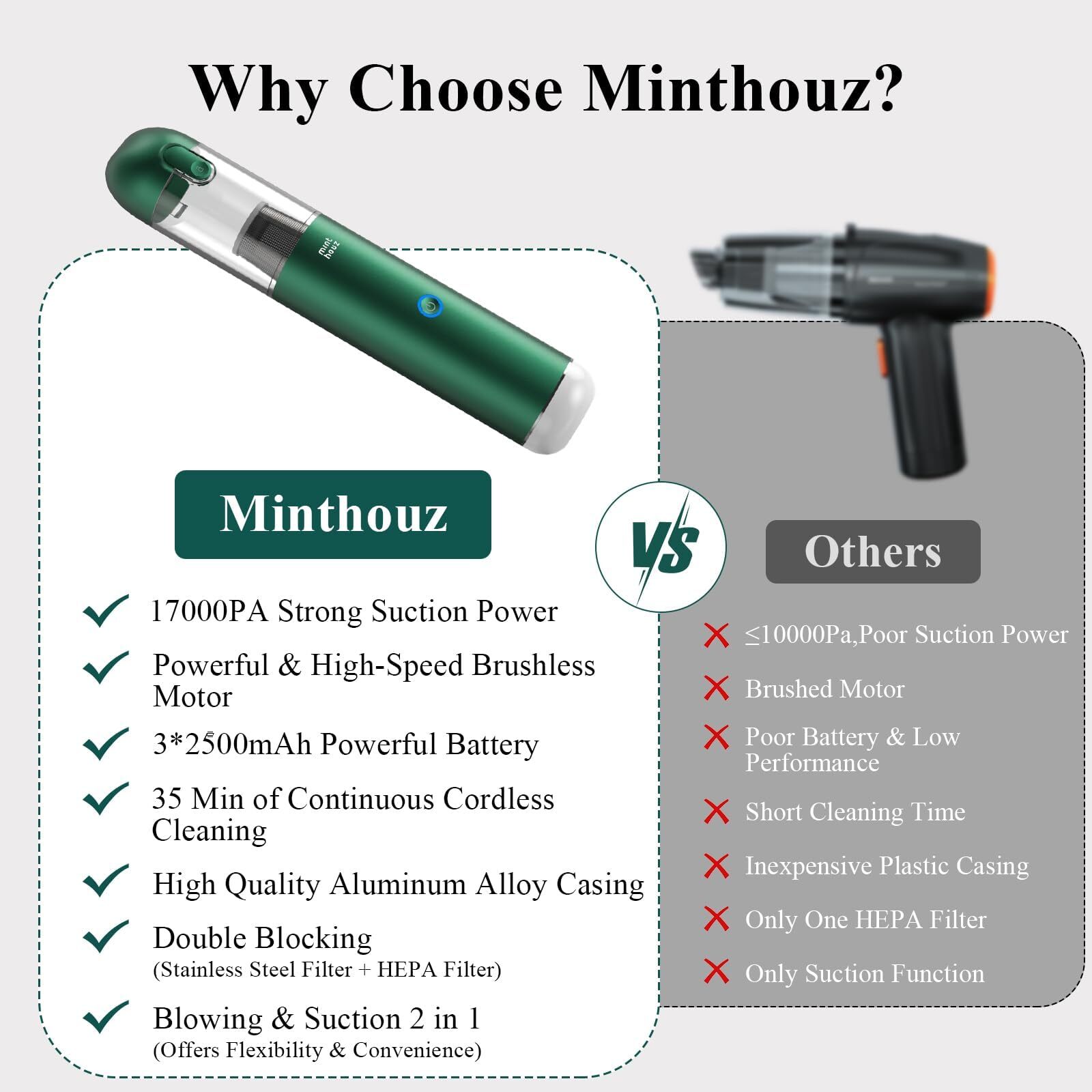 17000 Pa Powerful Suction: The car vacuums with best suction cordless is equipped with a powerful high-speed brushless motor (consume less power, run smoother, make less noise, and last longer than brushed motors), which generates a suction power of up to 17kPa, effectively removing dirt, dust, and debris from different surfaces; 17000pa strong suction power portable vacuum cordless allows you to clean your trash quickly without having to clean the same place several times over and over again, which saves half of the time compared to the low pa cordless car vacuum Long-lasting Battery with Quick Charge: This hand vacuum cordless rechargeable has a built-in 7500mAh rechargeable lithium-Ion battery, Ultra-high capacity can provide max 35 min of continuous cordless cleaning power after 4 hours full charging. The car vacuum cleaner is easy to recharge the battery by using a standard Type-C cable (included). Provide temperature/short circuit/overvoltage/overcurrent/overcharge protection to ensure the safety of the device. NOTE: Please use a charger with an output voltage of 5V/2A or more to charge the device Safety Aluminum Material & Dual-Filtration: The main body of this mini vacuum cleaner is made of premium aluminum alloy, which is durable and lightweight. Handheld vacuum cordless feature an enhanced HEPA filter that helps pick up and lock in 99.5 per cent of the microscopic dust particles that are invisible to the naked eye, and a high-quality stainless steel filter wrap that blocks most particles, further extending the life of the HEPA filter while ensuring optimal suction Cordless & Lightweight: This cord-free design mini car vacuum weighs only 1.08lbs, lightweight, making the portable vacuum cleaner easy to carry around and use anywhere. Equipped with a wireless design and one-button pour, this handheld vacuum cleaner boasts a built-in high-efficiency motor for effortless cleaning of hard-to-reach areas at home, office, or in your car. Also, The hand held vacuum cordless's 210 ml dust cup that can be easily emptied and cleaned, and the stainless steel and HEPA filters can be washed and reused Will Always Be With You: The cordless high powered car vacuum comes with an exquisite storage box, which makes it perfect best gift for family or friends! is committed to providing customers with the highest quality shopping experience, if you have any problems, please contact us, we will help you solve your problems within 24 hours and lifelong friendly customer service