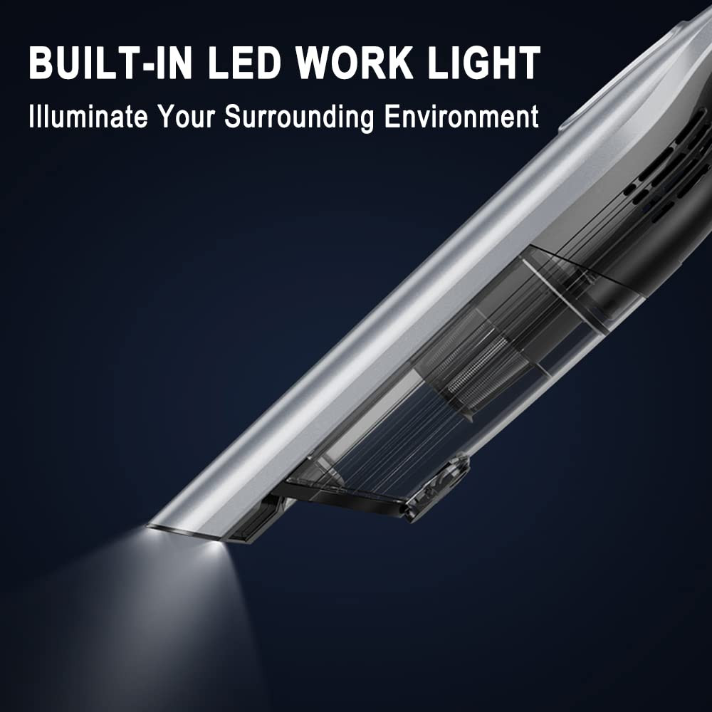 đ đăUpgrade Handheld VacuumăCORDLESS DESIGN- Cord-free! Rechargeable for Home! Home & Car & Office Use! This rechargeable portable car vacuum cordless hand vacuum helps you move easily to any hard-to-reach corners! Hand-held vacuuming cordless for pet hair! đ đăHand Vacuum Best SuctionăHandheld Vacuum Cordless adopts a cyclone anti-blocking design that can provide 85W/8000Pa strong cyclone suction, which can easily suck away dust, sundries, and snack chips. The vacuum car has a HEPA filter triple filtration that is washable and durable and doesn't require frequent replacement. Portable vacuum for cars also comes with 2 different brushes for all your car and home cleaning needs. The handheld cordless vacuum is a powerful partner for cleaning cars or pet hair! đ đăRechargeable Portable VacuumăHand Held Vacuum with a large capacity 6000mAh battery & charging dock, battery up to 30minutes, in less than 3-4hours for a full charging time within the charging dock. Built-in LED work light to illuminate your surrounding environment, providing convenience for your car travel. đ đăWashable & Easy to StoreăPortable car vacuum cleaner with a high-efficiency filter HEPA filter element and different brushes can be washed with water and can be used wet or dry, pay attention to clean and dry the filter, no need to change it frequently. Large-capacity dust bin, easy to empty the garbage, save time and effort to clean. đ đăWhat You GetăPacking list:1*Handheld Vacuum Cordless Car Vacuum Cleaner,1*Charging Dock,1*Cleaning Square Brush,1*Cleaning Flat Brush,1*USB Charging Cable. If you have any questions, please contact us. We will provide you with a satisfactory answer.