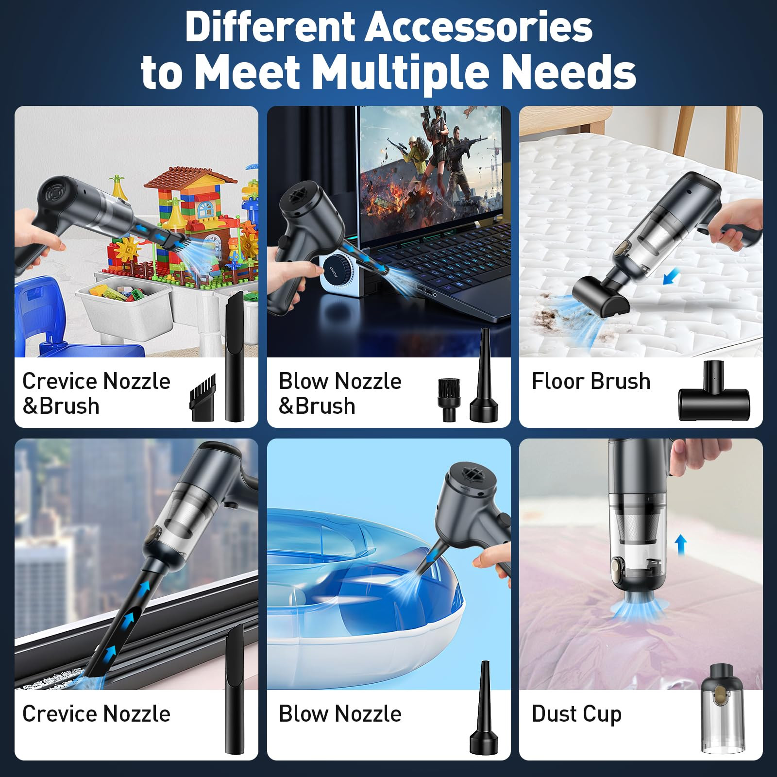 3 in 1 Mini Vacuum Cleaner: Compact vacuum cleaner comes with different accessories to meet the needs of different scenarios of daily sucking, blowing, inflation and vacuuming. Small vacuum has strong suction, used with the floor brush, crevice nozzle and brush can help clean up dust, debris, and other tiny particles, the other end of the vacuum cleaner is the blowing and inflating function, used with the long nozzle accessory you can easily blow away the dust inside the crevice of the keyboard or inflate air mattresses and swim rings. Dual-layer Filtration System: Handheld vacuum cleaner has a dual-layer filtration system, the front steel filter can prevent larger mess and debris, and the paper HEPA filter inside can prevent finer dust and particles, more efficient dual-layer filtration can extend the life of the motor. The steel and HEPA filters are washable and durable, and the extra HEPA filter can be used as a replacement. Note: If you find that the suction becomes weak, please wash the filter in time, the filter needs to be dried and then used! Portable & Lightweight: Car vacuum cleaner weighs only 0.85 pounds, equivalent to the weight of 2 cell phones, light weight, small size, a little bigger than your hand, kids can operate it. hand vacuum adopt cordless design, the use of the scene more free, and no wire entanglement, come with a carry bag, can store the car vacuum cleaner and all the accessories everywhere, put it in the home drawer, office desktop, car organizer. One-button Dumping Rechargeable Vacuum: Portable car vacuum built-in rechargeable battery, wireless vacuum provides cordless convenience, allowing you to move freely without being limited by cords or outlets. USB-C cable charging, the green indicator of mini vacuum reminds that is full charged, and can run about 20 minutes. Portable vacuum cleaner has one click dusting function, visual dust bin to empty debris in time, free your hands. Quick Cleaning for Light Work: The portable vacuum cordless is compact and comes with a variety of attachments that allow you to clean hard-to-reach areas, corners, upholstery, and more. Car vacuum can clean drop food debris on the vehicle's seats and floor, dust of kids toys in home, bread crumbs on laptops in office. Cordless vacuum makes cleaning fast and efficient, perfect for quick touch-ups or cleaning small messes. Packing List and Service: 1* little vacuum, 1*blowing nozzle, 1*blowing brush, 1*crevice nozzle, 1*crevice brush, 1*floor brush, 2* HEPA filters, 1*metal filter, 1*USB-C cable, 1*manual, 1*storage bag. If you have any question about cordless vacuum cleaner handheld, please contact customer team. Our customer team will try the best to help you.