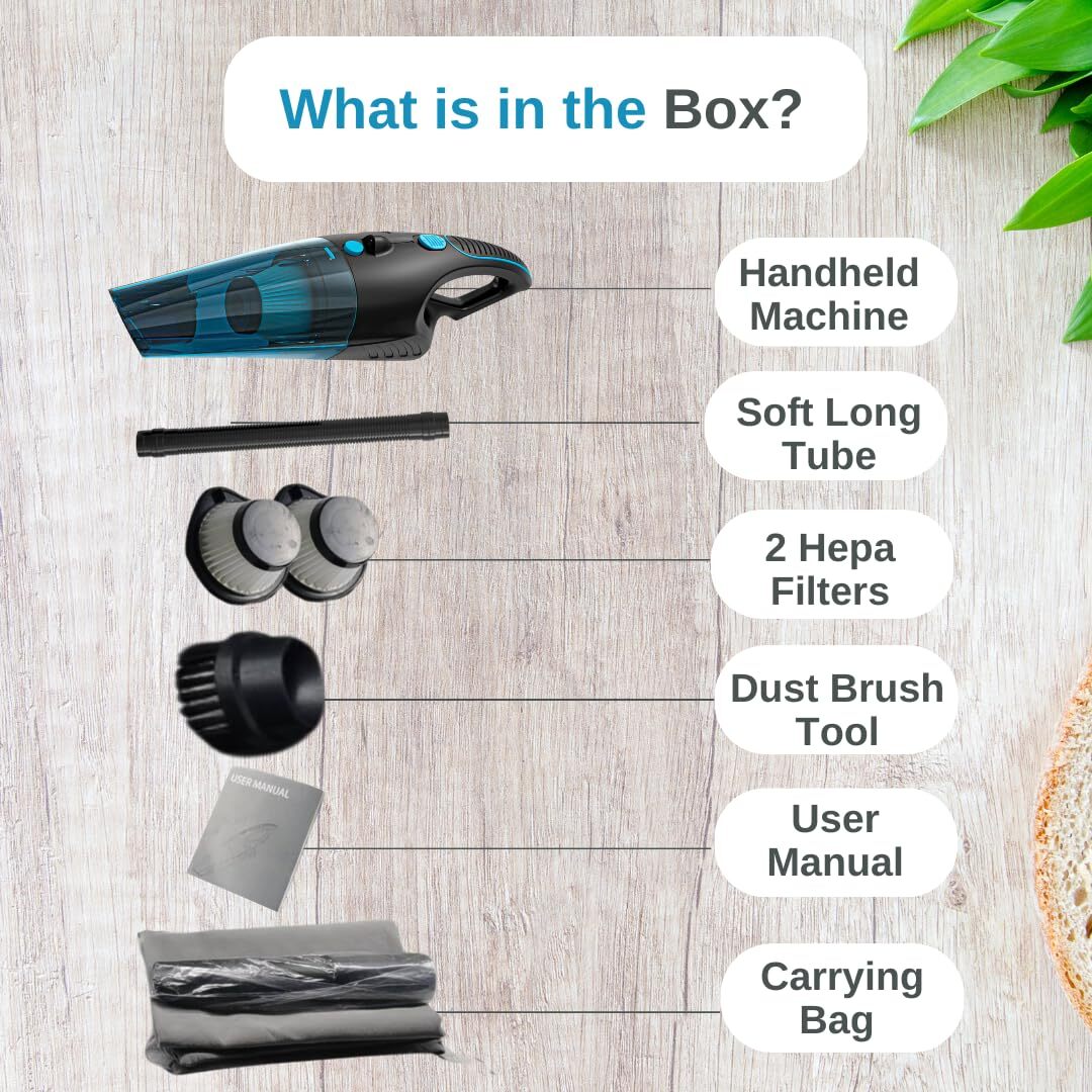 [Strong Suction Car Vacuum Cleaner]: Our handheld Vacuum Cleaner equipped with a high-performance motor provides 13000Pa strong suction and input power of 120W, making cleaning more efficient. Ideal for cleaning the sliding doors, tracks, windows, drawers, computer hosts, car doors, sofas, keyboards, sewing machines, pianos, etc. [Fast Charging]: A 2500-mAh lithium-ion battery is capable of operating continuously for more than 20 minutes on a single charge and has a 30-day standby period when fully charged. The quality of the battery with lithium that powers the cordless vehicle vacuum can be charged in three to five hours, and it lasts for an exceptionally long period when cleaning. [Deep Cleaning]: This cordless mini vacuum cleaner has a strong motor and a long battery life, helping you to clean all areas. The portable vacuum cleaner cleans dust, crumbs, and pet hair from carpets, kitchens, living rooms, and workplaces with outstanding performance. [Reusable & Washable Filter]: This portable vacuum cleaner has a high-density filter, which is stronger and more durable than standard filters. It is easy to assemble and detach, and it may be removed. The car vacuum HEPA filter is washable, however it must be dried before being placed in the dust collection hood. Regular cleaning of the washable filter may effectively reduce suction loss and clogging while maintaining good suction power. [Portable & cordless]: This compact and handy cordless hand vacuum cleaner weighs only 0.84 kg, but has more suction power and is lighter, so it is also suitable for older people and children. The cordless design makes the handheld vacuum cleaner battery with wall mount easy to clean, without bulky or tangled cables.