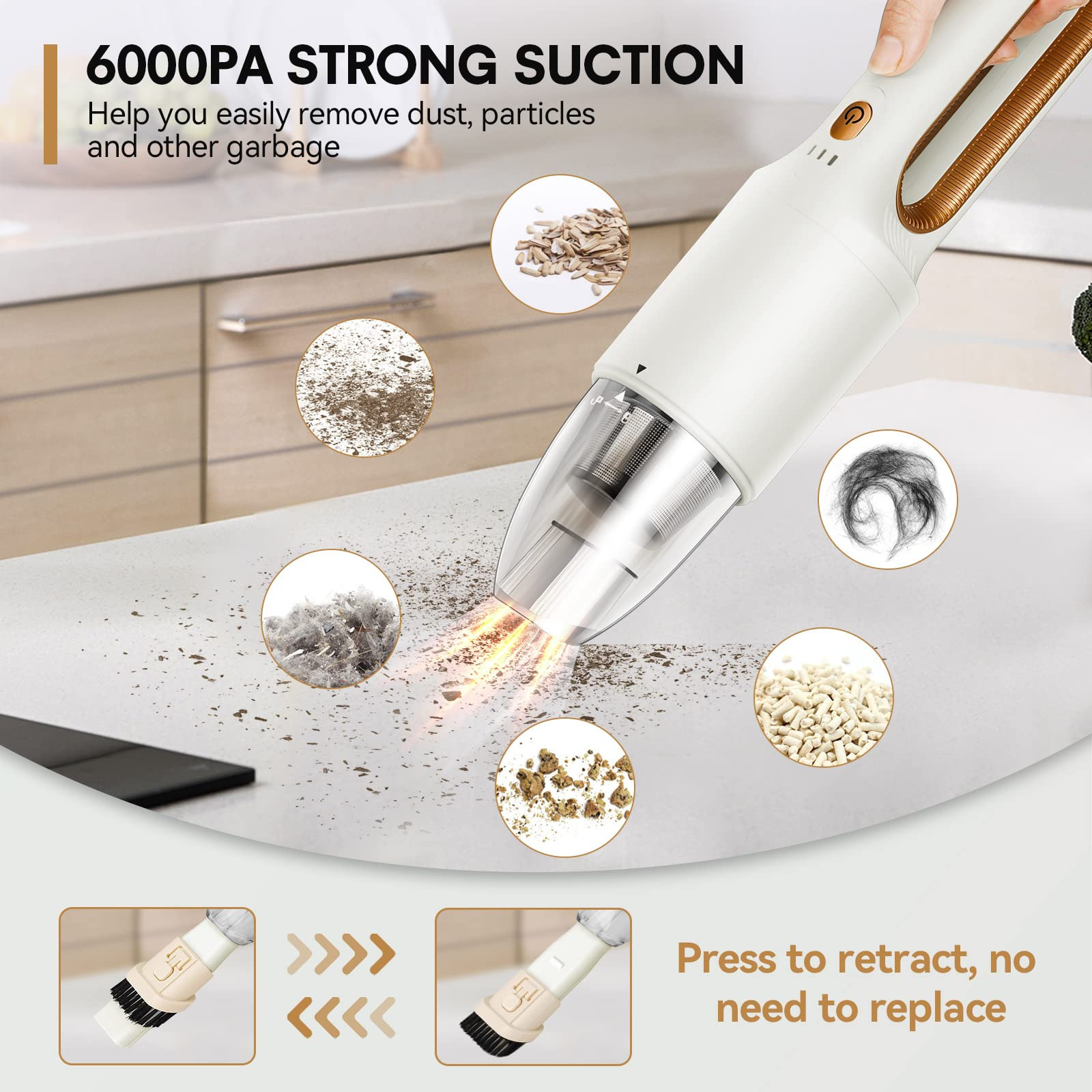 2-in-1 Versatile Cordless Vacuum Cleaner: The cordless vacuum cleaner combines the power of two models in one. Mode 1: A handheld vacuum that delivers 6000Pa suction, making it ideal for picking up dust, debris, pet hair, and paper waste in tight spaces. Mode 2: A detachable pusher vacuum that offers cordless convenience for easy floor cleaning, letting you reach every corner effortlessly. Whether you need a car vacuum for quick cleanups or a handheld cordless vacuum for daily tasks, this versatile vacuum cleaner covers all your needs. Multipurpose Mini Vacuum for Every Surface: Designed with an ergonomic grip and an integrated cleaning brush that can be quickly swapped out, this mini vacuum is perfect for tackling a variety of surfaces, including desktops, sofas, and car interiors. It’s also an excellent high-power car vacuum cleaner for maintaining your vehicle’s cleanliness. The 300ml dust collection cup allows for multiple uses before needing to empty, making this cordless vacuum a practical choice for home and car cleaning. Lightweight and Portable Handheld Vacuum: Weighing only 500 grams and measuring 14" H x 2.7" W, this portable vacuum cleaner is compact and easy to carry. It’s perfect for use as a car vacuum, and its USB charging feature allows for flexible charging at home or in your vehicle. Whether you need a hand vacuum for quick pickups around the house or a portable vacuum to keep in your car, the cordless vacuum cleaner is the ideal solution for on-the-go cleaning. High-Efficiency Dual Filtration System: This handheld vacuum is equipped with an advanced dual filter setup, featuring a washable HEPA filter and a stainless steel filter that together capture 99.99% of dust particles. The durable lithium battery provides up to 30 minutes of powerful cleaning. For the best performance, fully charge the vacuum before each use to ensure it's always ready when you need it. Whether tackling tight spots as a mini vacuum or handling larger areas as a portable hand vacuum, it consisten. Premium Customer Service: This vacuum cleaner, equipped with a beautiful outer box, is perfect for gifting. If you have any problems during use, we will be happy to help you.