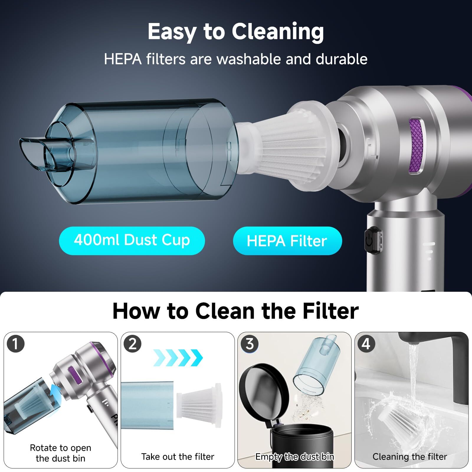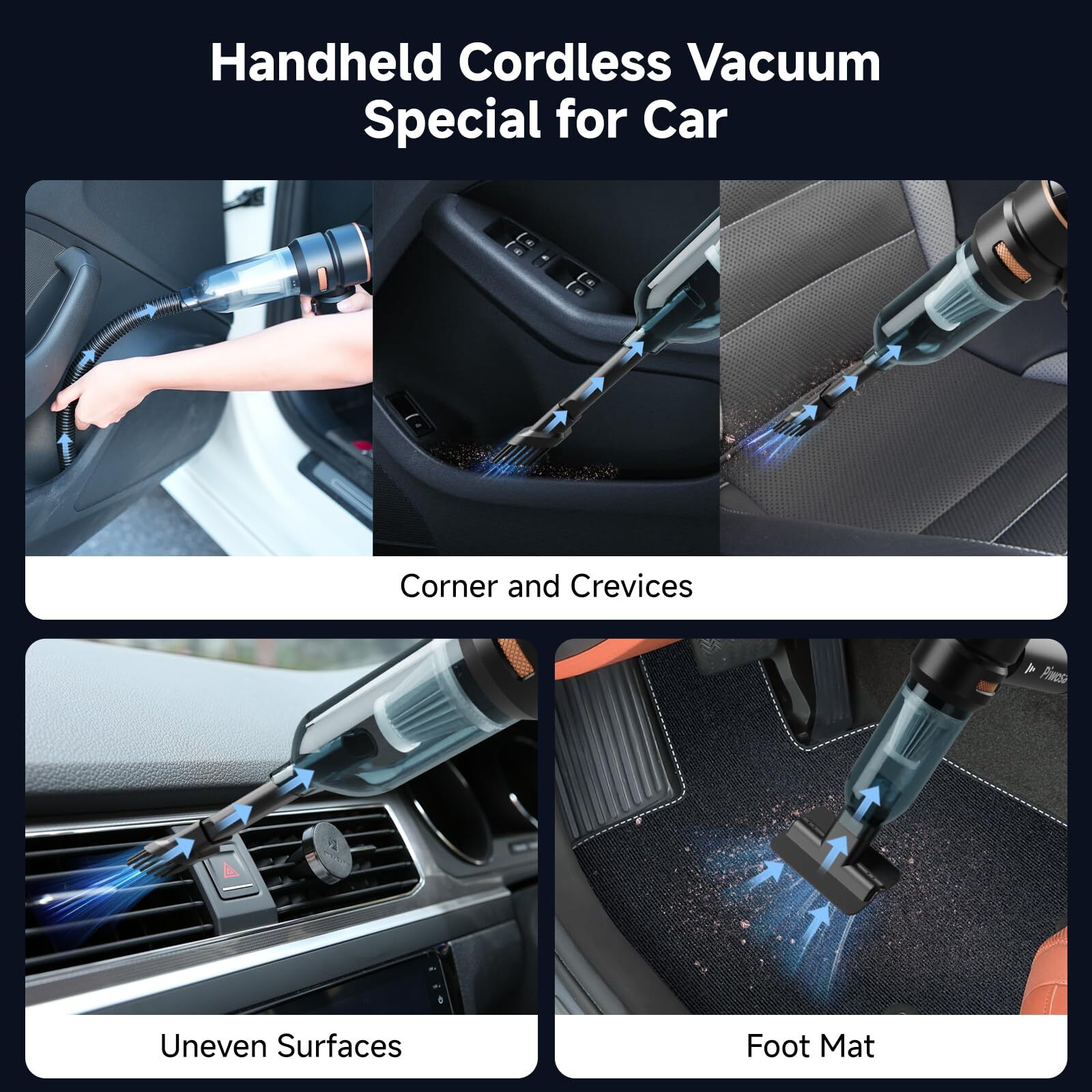 【16000PA Car Vacuum Cleaner】 This cordless car vacuum cleaner is equipped with an upgraded 110W powerful and high-speed brushless motor and advanced noise reduction technology, providing powerful performance and reducing the noise to less than 70 decibels. The 3 adjustable suction power modes of 6000PA, 12000PA and 16000PA, with a powerful 16000PA suction power, this small handheld vacuum cleaner allows you to clean pet hair, crumbs, dust and sand hidden in the car seat or sofa. 【Versatile 4-in-1 Design】More than just a vacuum cleaner, this wireless car vacuum is equipped with a variety of accessories that can blow, vacuum and pump for a variety of scenarios, which is very helpful to reach small areas that a larger vacuum can't, it's perfect for removing dust, cleaning keyboards, inflating outdoor gear and deflating storage bags, anytime, anywhere. 【Rechargeable Battery and Fast Charging】The hand held vacuum cordless cleaner has a built-in 6000mAh battery with a fast charging port, and can be used for about 35 minutes. It supports type C charging and can be easily charged with a car charger, mobile power, laptop, rechargeable battery and other methods, quickly fully charged in 4 hours with 5V/2A adapter. 【Compact and Easy to Carry】Piwosa air blower&handheld mini vacuum cleaner is small and weighs only 1 lb, an ordinary drawer or car storage box can accommodate it, and we are equipped with a storage bag that can hold all the accessories, so it is convenient for you to carry it on the go. 【Reusable and Washable HEPA Filter】 It comes with 1pc HEPA filter, which filters fine dust during use and can be easily washed and reused. It also comes with a large capacity 400ml dust cup. The transparent design allows you to clearly see the dust collection process and reminds you when it needs emptying. It's easy to swivel and detach for easy emptying. The swivel snap design is safer so you don't have to worry about dust spilling out.