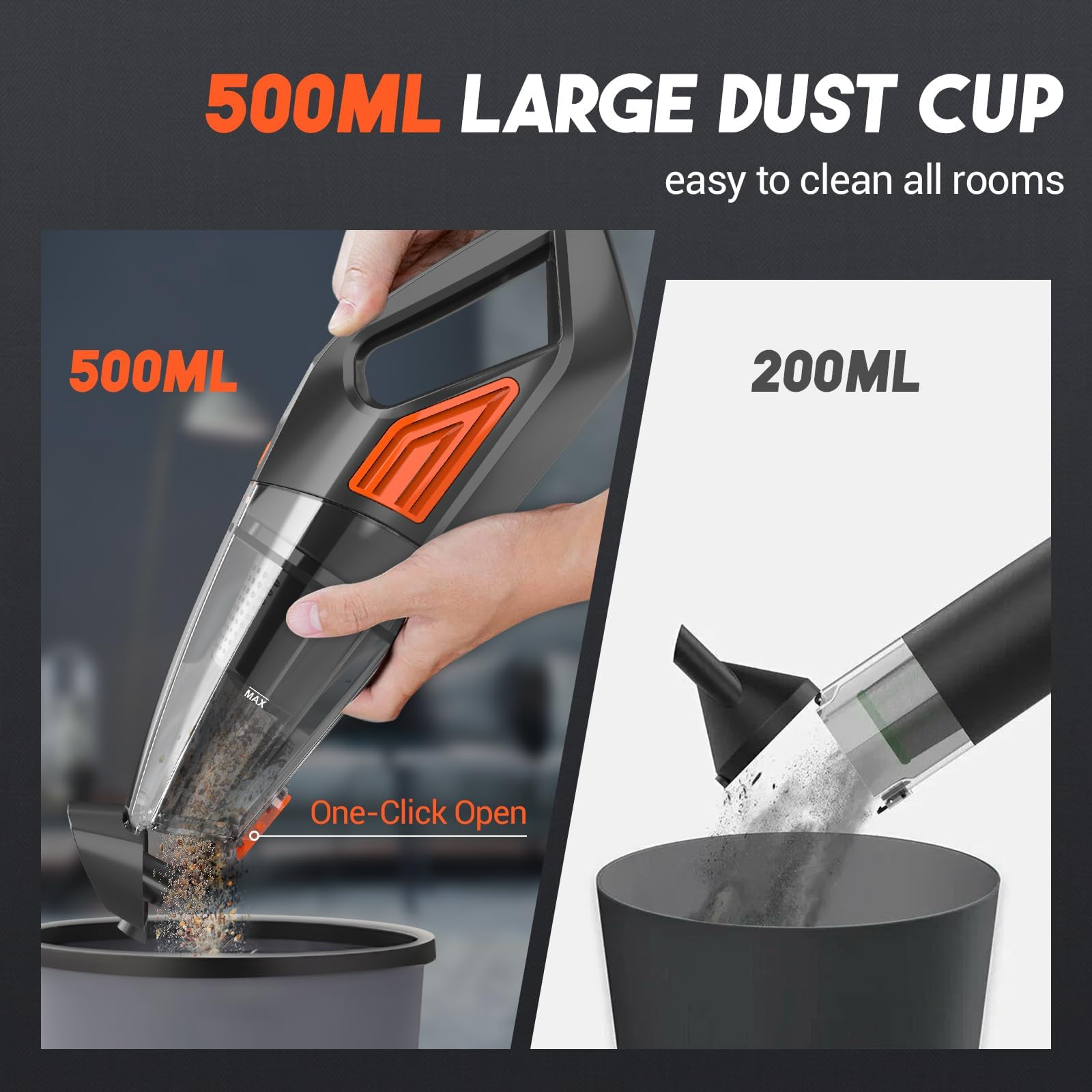 Powerful Suction and Two power modes: Cordless Handheld Vacuum cleaner with built-in high efficiency motor. It can provides 9000Pa super suction at powerful mode. Easy to clean dust, debris, pet hair, etc Cordless Ultra-light: Handheld vacuum cleaner is cordless and just 2.2 pounds weight, which is suitable for people with different ages to operate. It can help you move freely to clean your home, office, car or hard-to-reach corner. because handheld vacuum cleaner is very light, which is easy for home and car cleaning. Multi-suction nozzle and Large Capacity Dust Cup: This handheld cordless vacuum cleaner comes with 2 different accessories to meet your different needs. And it has a 500ML trash to clean in all directions Fast charging: The handheld vacuum cordless machine is equipped with a 2500mAh lithium-ion battery and can be fully charged in only 3-3.5h, running for about 25 minutes, while the LED indicator shows the remaining power to remind you to charge. After sales service: This hand-held cordless vacuum cleaner is the perfect gift for friends and families to enjoy the smart life. If you have any question or inquiry about our products, please feel free to contact us. Our client service team is always ready for your inquiry and will do our best to help each client.