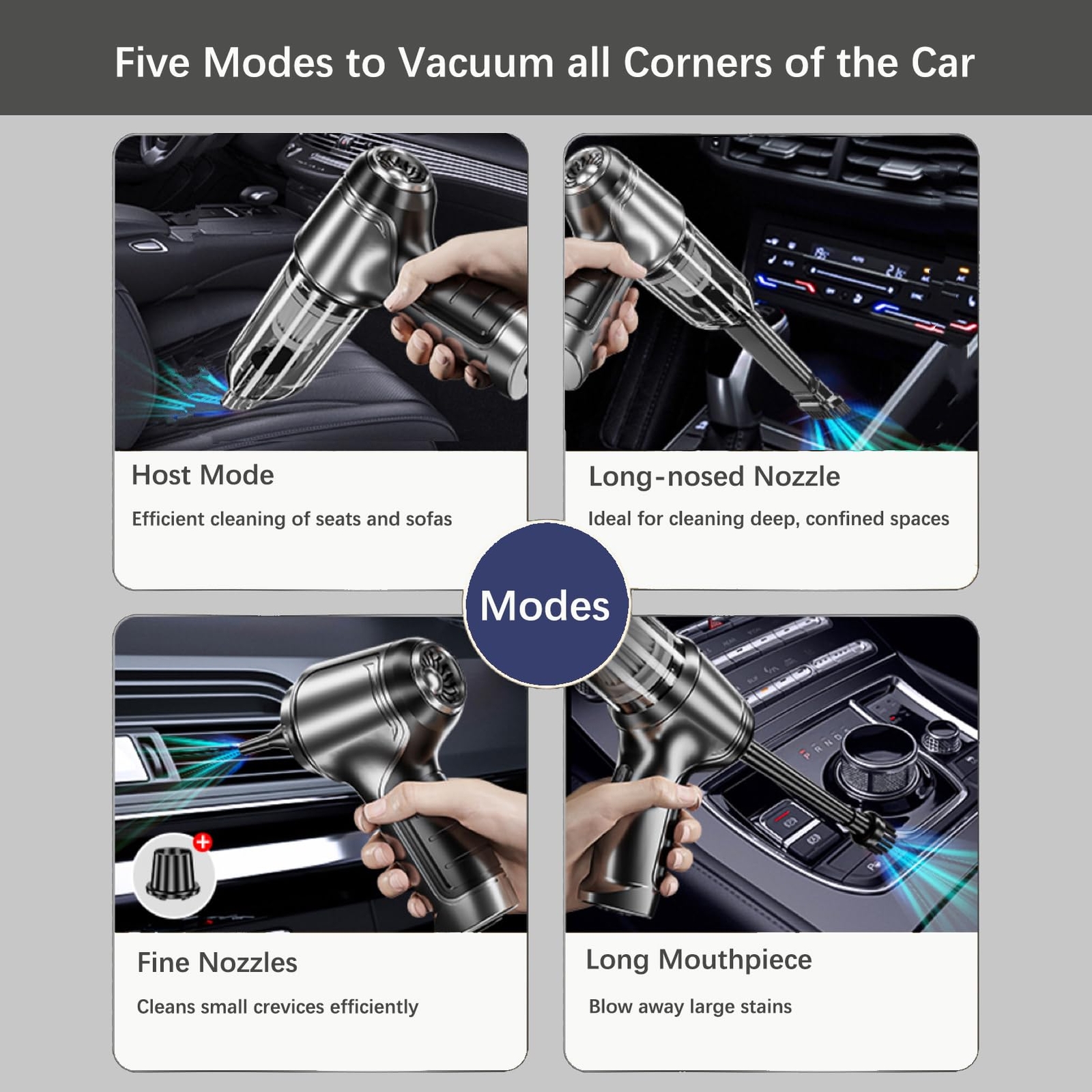【3 in 1 Multifunction Car Vacuum】3 in 1 cordless hoover vacuum for car, this car vacuum cleaner comes with several nozzles that can be switched between three modes: vacuum mode, dust blowing mode, and vacuum sealing mode, which not only cleans large areas of dust, but also cleans dust in the crevices, and can be used to inflate a balloon, or vacuum seal. 【Portable Vacuum for Car】This hand held vacuum cordless weighs only 1 pound, hand vacuum is easy to hold, small and easy to use for small cleanups. The cordless car vacuum cleaner is also flexible to use and place in your car, regular drawers or tight spaces. We also include an organizer bag that holds the vacuum cleaner and all of its accessories for on-the-go convenience. 【Rechargeable Operation】Our cordless rechargeable hand vacuum is equipped with the latest 2x2000mAh high-capacity battery and fast charging technology. Type C charging device is designed so that the small vacuum cleaner can be recharged at any time. 【Car Vacuum Cleaner High Power】Brushless vacuum cleaner for car with cone seal technology, equipped with a brushless motor 15000PA power, air pressure doubled, suction, blowing, vacuuming function are powerful. 【High Quality Filters】Reusable HEPA filter can be washed and air-dried. Wireless handheld car vacuum cleaner strong suction comes with 2 different filters. The HEPA filter can be washed and reused, and the steel filter can be reused again with a simple wash for a longer lifespan. In addition to the filter that comes with the cordless hoover vacuum and blower for car itself, this kit also includes 2 replaceable filters. 【Widely Used】This handheld vacuum cleaner can meet a variety of use scenarios such as blowing, vacuuming and pumping, car vac can be used for vacuuming and cleaning in cars and sewing machines, as well as blowing keyboards, engine compartments, balloons, charcoal grills, and swimming rings, etc., and car vacuums with suction cordless can also vacuum-seal food bags and storage bags. Mini vacuum cordless has a built-in brush and nozzle to easily clean crumbs, dust or pet hair from crevices. 【Instructions for Use】 To start, you need to press and hold the button of cordless handheld vacuum cleaner for about 3 seconds. Then, pressing the mini car vacuum button again will switch to higher speed/higher power, and pressing the button of cordless hoover car vac and blower a third time will turn it off.