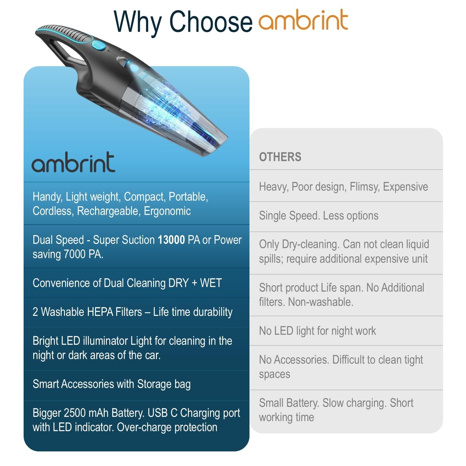 Deep Clean Anywhere with the Ultimate Handheld Vacuum Cordless! The Handheld Vacuum Cordless Rechargeable is your go-to cleaning companion for cars, homes, and offices. With its 13000PA powerful suction, lightweight design, and versatile attachments, this cordless handheld vacuum cleaner ensures no dust, dirt, or pet hair is left behind. Perfect for daily cleaning tasks or tackling tough messes, it's a must-have tool for anyone seeking convenience and performance in a portable vacuum cleaner. Why Choose the Cordless Hand Vacuum Cleaner? POWERFUL 13000PA SUCTION FOR MAXIMUM CLEANING This handheld vacuum packs an impressive 13000PA suction power to handle crumbs, dust, pet hair, and debris with ease. Whether you need a small vacuum cleaner for tight spaces or a heavy-duty solution for your car, this cordless car vacuum cleaner delivers exceptional results. LIGHTWEIGHT, CORDLESS, AND PORTABLE DESIGN Weighing only 0.84 kg, this handheld vacuum cordless is designed for effortless mobility. The portable vacuum cordless design makes it perfect for cleaning hard-to-reach areas at home, in the car, or even on the go. Its ergonomic build is suitable for everyone, including kids and seniors. LONG BATTERY LIFE AND FAST CHARGING Equipped with a high-capacity 2500mAh battery, this hand vacuum cordless rechargeable offers up to 20 minutes of continuous operation. Fully recharged in just 3-5 hours, it’s always ready to power through your cleaning routine without interruptions. WASHABLE AND REUSABLE HEPA FILTER The dust buster handheld vacuum features a durable, high-density HEPA filter that’s easy to remove, wash, and reuse. Regular cleaning helps maintain suction power and extends the lifespan of the filter, ensuring consistent performance for your cleaning needs. VERSATILE ATTACHMENTS FOR COMPLETE CLEANING Tackle any cleaning task with the included accessories: Crevice Tool: Perfect for tight spaces and corners in your car or home. Brush Nozzle: Ideal for pet hair, carpets, and upholstery. Extension Tube: Reach high or low spots with ease. These tools make this cordless hand vacuum cleaner suitable for cleaning everything from car interiors to delicate electronics. Stay Ahead with the Handheld Vacuum Cleaner Whether you’re dealing with everyday messes or preparing for deep cleaning, the handheld vacuum cordless rechargeable has you covered. Its combination of powerful suction, portability, and thoughtful design ensures it stands out as one of the best cordless vacuum cleaners for cars and homes alike. ✅ Cordless & Rechargeable: – No tangled wires or power limitations! The Handheld Vacuum Cleaner is cordless, offering freedom to clean anywhere—cars, sofas, tight spaces—without searching for outlets. Its USB-C fast charging ensures quick power-ups, making it ideal for on-the-go cleaning at home, office or on the road. ✅ Powerful & Dual mode efficiency: – With a 120W super fast motor and 13,000PA suction in Super-Suction Mode, Handheld vacuum tackles pet hair, crumbs, and deep-seated dirt effortlessly. Switch to Power-Saver Mode (7,000PA) for lighter tasks, extending battery life while maintaining strong performance for everyday messes. Switching modes with a mere slide of thumb is as easy as pie. ✅ All-Surface Dry/Wet Cleaning: – Anbrint Handheld Vacuum Cleaner works on tiles, wood, carpets, upholstery, and even wet spills! The dual Dry/Wet function ensures versatile cleaning, while the washable HEPA filter traps dust and allergens. Perfect for cars, kitchens, and hard-to-reach spots like under furniture or car seats. Ideal for last-minute clean-ups before guests arrive or a quick car refresh before a road trip. ✅ Built-In Bright LED Light: – Never miss hidden dirt! The bright LED flashlight in Handheld Vacuum Cleaner illuminates dark corners, ensuring thorough cleaning in car boots, under sofas, or dimly lit areas. No more guessing—just spot, suck, and shine, for a flawless clean every time. ✅ Ergonomic & Lightweight: – Vacuum Cleaner is designed for comfort and ease, its curved handle fits naturally in your palm, reducing strain during extended use. Weighing just *1.2kg, it’s easy to maneuver without tiring your arms—ideal for quick clean-ups in homes, offices, or cars. No more dragging out a heavy vacuum—this lightweight powerhouse gets the job done fast, so you can get back to your day. It’s so light and balanced that even kids can use it.