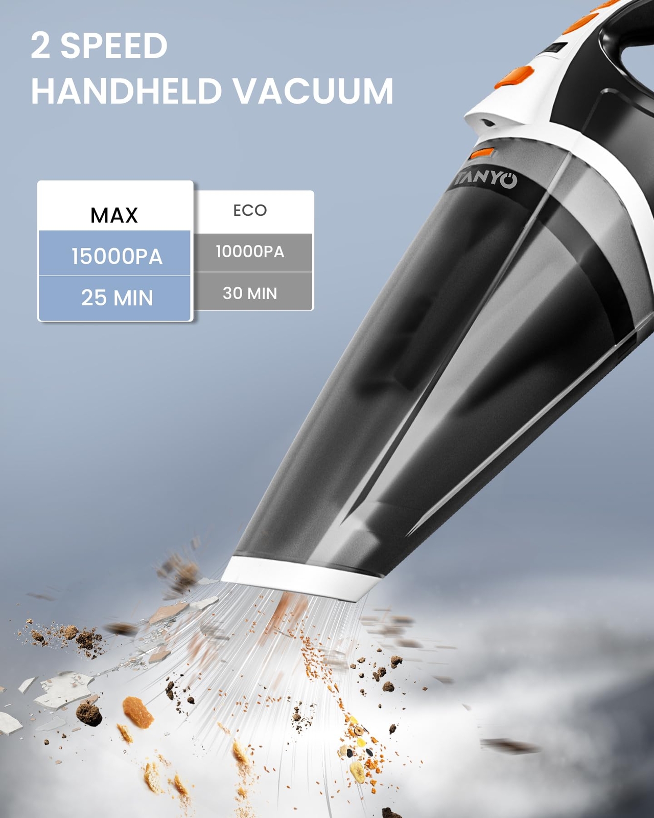 Strong Suction & Quiet Operation: This handheld vacuum features a powerful 15000Pa brushless motor with 2 adjustable modes (ECO-10KPa and MAX-15KPa) to effortlessly clean pet hair, debris, and crumbs from your car, home, or office. Despite its high power, it operates at a noise level below 65dB, ensuring a quiet and peaceful cleaning experience, while its compact size ensures convenient usage anytime and anywhere. Perfect for car detailing and home use, this car vacuum cleaner high power. LED Light & Professional Accessories: Rechargeable wireless design enables the handheld vacuum to operate without constrains of power cords, It can be used for cars but also perfect for home, office and RV travel. The vacuum cleaner features a built-in LED light that illuminates dark areas, making it easier to clean hard-to-reach corners. It comes with 3 professional accessories-an extension, a floor brush and a cleaning brush - to meet different cleaning needs. Long Life & Easy Trash Disposal: With its built-in 2500mAh Li-ion battery and a fast charging port, car vacuums with best suction cordless can work up to 27 minutes continuously. The portable vacuum cordless with USB-C charging cable has the latest fast charging technology, and fully charging only takes 3.8 hours. The 850ml dust cup allows you to handle more dirt in a single go. The washable and reusable HEPA filter ensures efficient suction power while preventing blockage. Upgraded Filtration & Clogging Function: Comes with an upgraded filtration system and a clogging function to protect the cordless vacuum. When the HEPA gets dirty, air will not go through it. The suction power may decrease or the car vacuum cleaner may stop working to prevent damage to the motor. You can rely on this feature to maintain optimal suction power and extend the lifespan of the hand held vacuum. Exceptional Customer Support: The small vacuum cleaner helps your family, friends and lover make mundane chores effortless and enjoy a more comfortable, clean and healthy life, bringing unique surprises to them at special days. We offer a professional after-sales team with 24-hour online response. If you have any questions or problems about the aspiradora para carro, don't hesitate to contact with us.