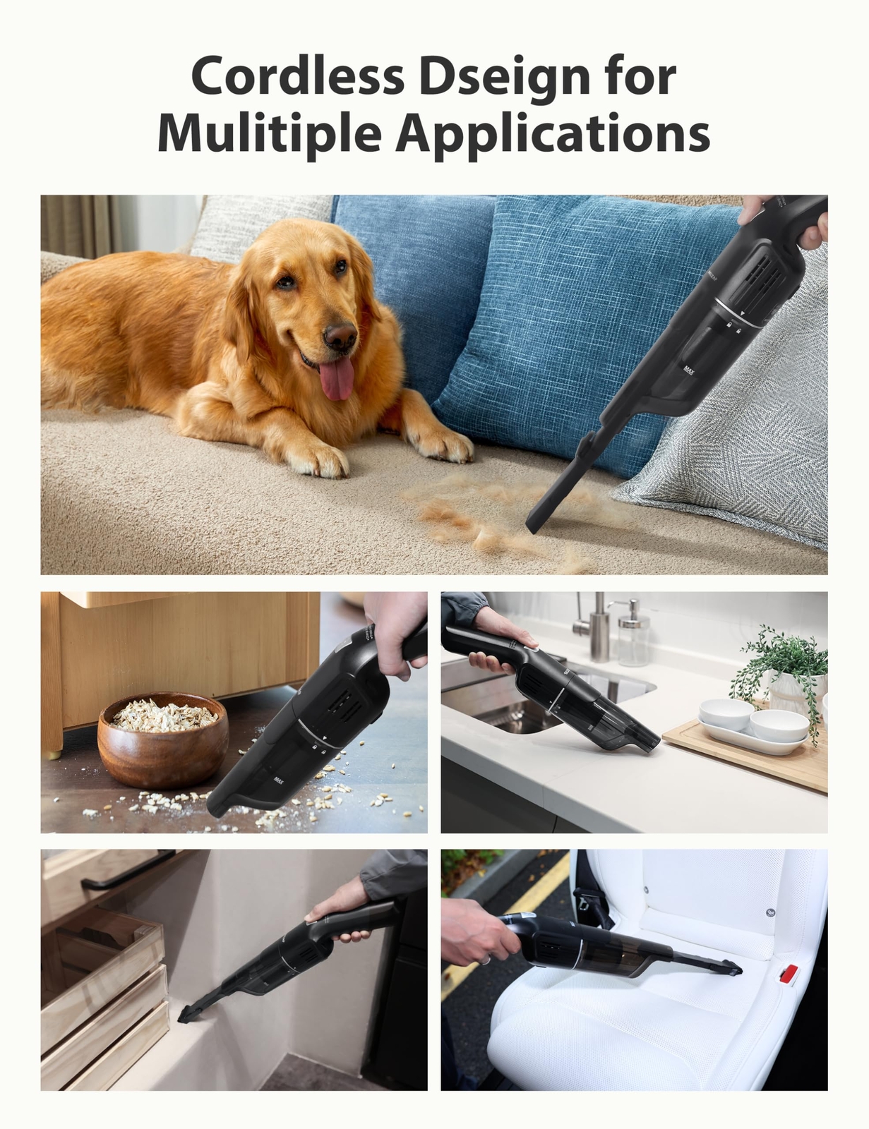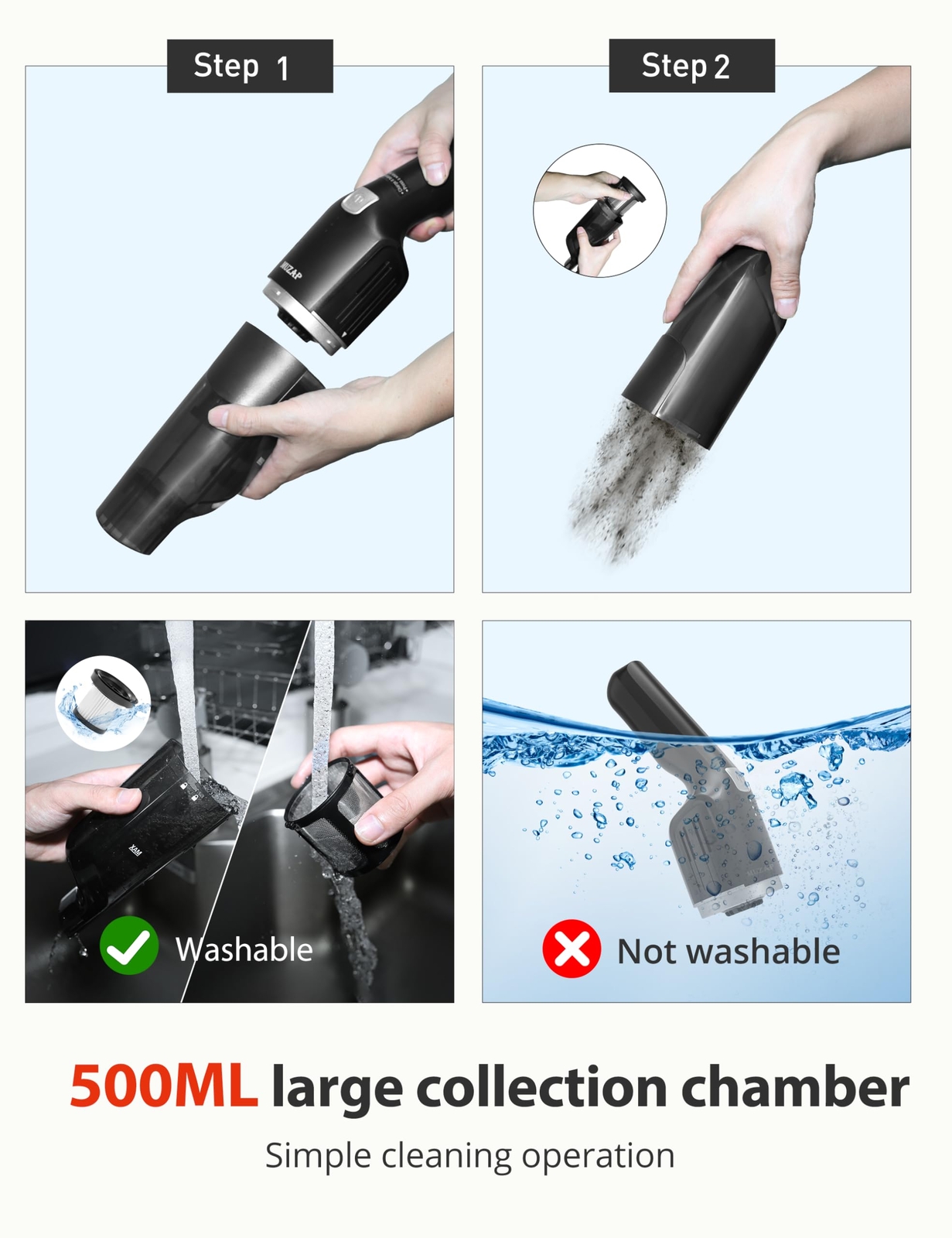 ππ€π¬ππ§ππͺπ‘ ππͺππ©ππ€π£:The handheld vacuum cordless features a self-developed high-speed motor with two suction modes (Standard and Max Power),Clean stubborn pet hair from carpets,stairs,carand other upholstery 2-ππ£-1 πΎπ‘πππ£ππ£π ππ€π€π‘:Designed for easy cleaning of tight spaces such as sofa crevices,car seats,kitchen corners,and keyboards,effectively removing pet hair and small particles. πΏπ€πͺππ‘π πππ‘π©ππ§ πππ¨πππ£:99%Dust removal rate,filter element can be cleaned and reused. 500ππ πΏππ©ππππππ‘π πΏπͺπ¨π© πΎπͺπ₯: A large-capacity dust cup with washable filter and metal mesh.Replacement filters are available for separate purchase. πΎπππΏππππ πΎπππππππππΎπ- Portable, rechargeable,+lightweight for use around your home and in your vehicle.With a charging base,more convenient placement. πππ¨π© πΎπππ§πππ£π &πππ¨π©ππ£π ππ€π¬ππ§:Ultra-high speed motor+with dual charging system, Full charge time is 4-5 hours,Standard mode (8000pa): Run for 30 minutes, Maximum mode (15000pa): Run for 15 minutes. ππ§ππ€π£π€π’ππ πΏππ¨πππ£:This lightweight, handheld vacuum cordless is ergonomically designed with a comfortable handle, Just 1.4lb,suitable for users of all age groups. πππ₯π’πππ₯π πππππ«-πππ₯ππ¬ πππ«π―π’ππ:Backed by factory-direct production, providing excellent support and a 1-year warranty.