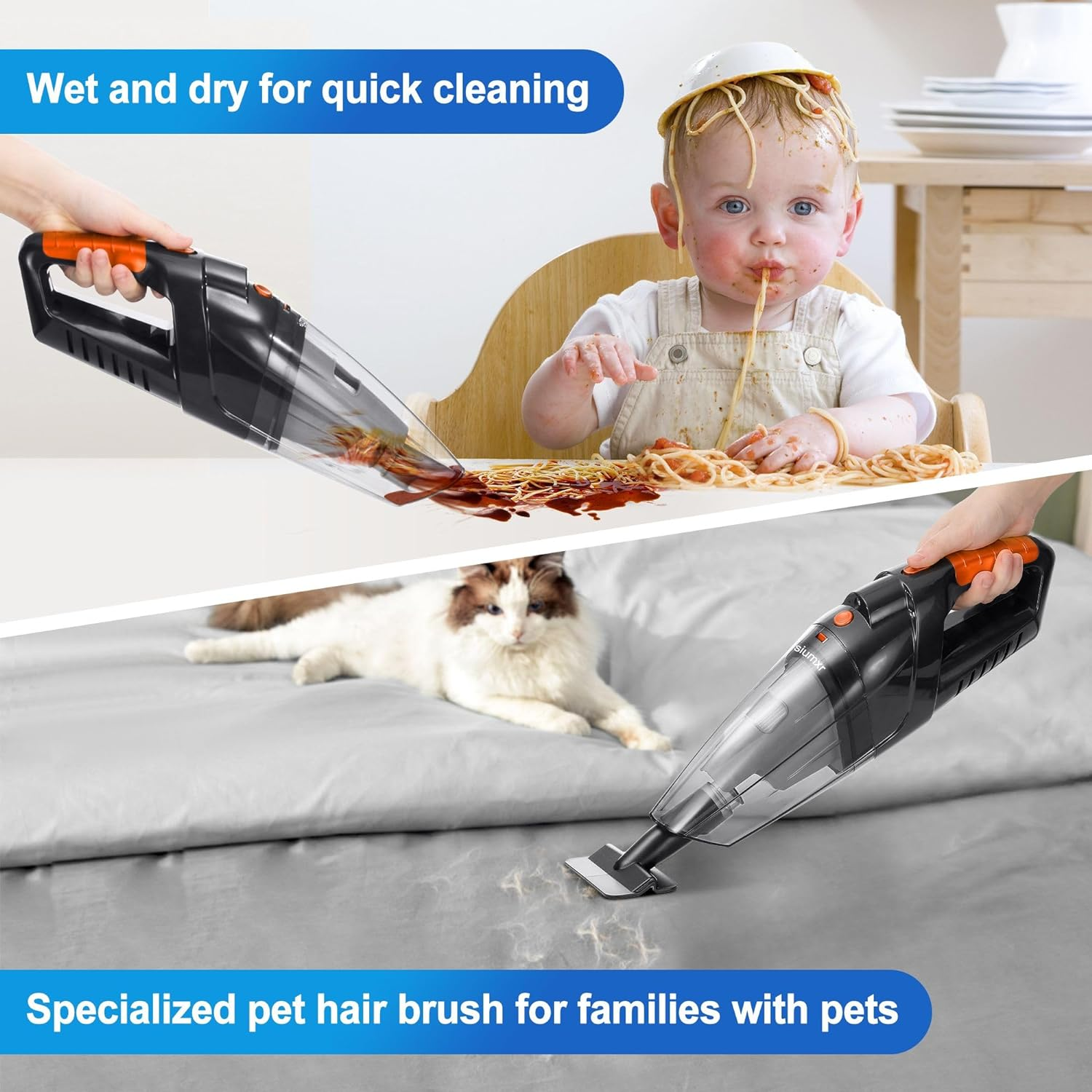 Cordless and Portable Design: This hand vacuum cordless rechargeable is easy to carry and use, Four accessories allowing you to clean hard-to-reach areas effortlessly.making it convenient for quick clean-ups in home dining room table, carpet, stairs, car already corners. Upgraded Suction and LED Light: This car vacuum cordless has built-in LED lights to illuminate dark corners of your car, and our dust buster hand vacuum delivers 9,000Pa of ultra-strong suction to ensure no dirt or debris is left behind. Wet and dry Cleaning: This portable vacuum can handle both wet and dry messes,great for dealing with kids' after-dinner crumbs, this portable vacuum cordless can also help you with pet hair and litter on sofas and floor stalls. Fast and Safe Charging: This cordless car vacuum cleaner adopts type-c charging cable for safety and speed, and has 2000*3 mAh long-lasting lithium battery, which can be used for 30 min after two hours of charging. Portable Vacuum for Car: This vacuum for car 80w high-power,rechargeable is designed to tackle tough cleaning tasks with ease.There's also a 9.8 footer cigarette lighter line, which can meet the requirements of cleaning your entire vehicle. After-Sales Service: If you have any questions or problems, please contact us for assistance, the customer support team can assist in resolving any inquiries or problems within 24 hours to ensure customer satisfaction! Product Description