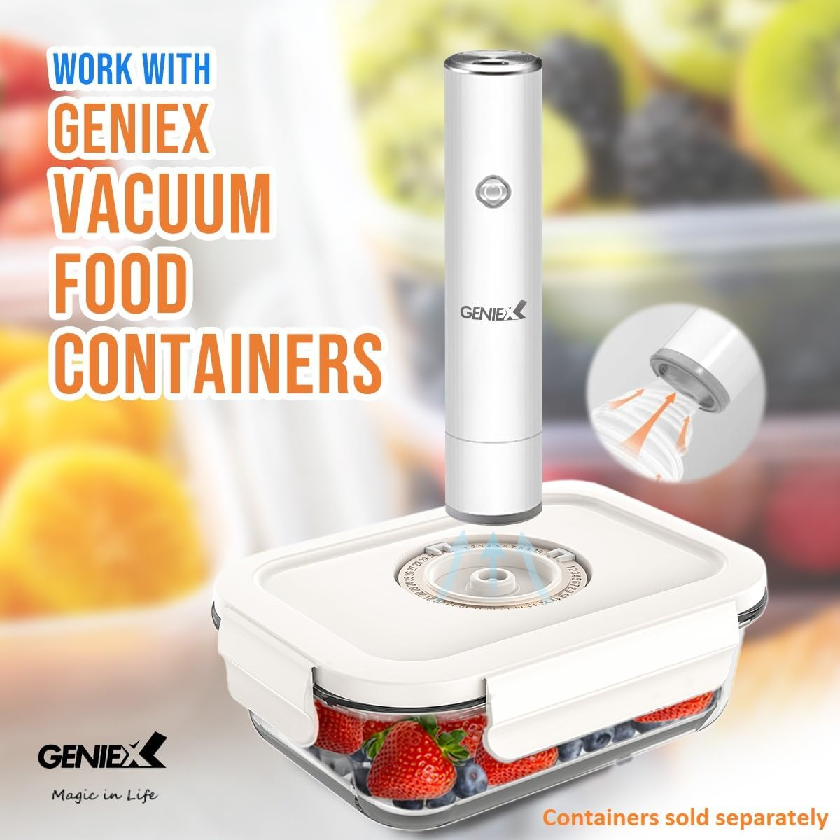 ✔️【AUTOMATIC & POWERFUL】Keep food fresh and longer by extracting air inside the GenieX Vacuum Food Saver Bags or GenieX Vacuum Seal Containers with just one-button operation. The GenieX Food Saver Handheld Vacuum Sealer automatically stops when the desired vacuum level is achieved. Easy and hassle-free operation. Try and save effort if you are still using those manual vacuum pump. (Vacuum Bags and Containers sold separately) ✔️【PORTABLE SEALER FOR FOOD STORAGE】GenieX Rechargeable Electric Pump for vacuum storage work with vacuum zipper food bags, reuseable zipper sous vide bags, vacuum food containers and as wine saver pump. Automatic, rechargeable, and work with multiple food storage gadgets. (Bags and Containers sold separately) ✔️【3X FRESHNESS】Food storage in fridge using double zipper reuseable vacuum freezer bags can keep freshness longer time compared to normal freezer storage. Food Saver Vacuum sealer bags save freezer space and keep freezer neat and clean. Effectively store meats, fish, fruits, vegetables, seafood, cooked dishes, snacks, cookies, nuts, and beans. (Freezer Bags sold separately) ✔️【SOUS VIDE ENABLE】GenieX hand held vacuum sealer for food enables you to vacuumize Reuseable Vacuum Food Saver Bags for sous vide cooking. Zip the food bag and vacuumize with GenieX handheld sealer, even when travel (Food saver bags sold separately) ✔️【COOL HOME GADGETS】Great kitchen gadgets for vacuum food storage or wine preservation. The mini vacuum sealer pump is handy and work perfectly with GenieX Food Saver Bags and GenieX Vacuum Food Storage Containers (sold individually). These gadgets make perfect food storage solution for every household. Wonderful home gift and perfect housewarming gifts. Tip: GenieX hand held Vacuum Sealer sold individually. Other Vacuum Storage equipment, such as Vacuum Food Saver Bags and Vacuum Glass Food Containers are available for individual purchase. Product Description GENIEX HANDHELD VACUUM SEALER FOR FOOD STORAGE – KEEP FRESH, VACUUM SEALED GenieX handheld vacuum sealer works with GenieX Food Saver Bags. The Pen Shape mini vacuum sealer vacuumize the vacuum sealer food saver bags with just a press. It automatically stops when vacuum level is reached, effortless and efficiency for home and food storage. (Bags sold separately) KEEP FOOD FRESH 3x LONGER WITH GENIEX VACUUM FOOD CONTAINERS (SOLD SEPERATELY) GenieX Vacuum glass containers set are nice food storage gadgets, BPA free, safe for reheat in microwaves and ovens. Vacuumize food containers for meat, fish, fruits, vegetable for freshness 3x longer. Can also be used as marinated container or meal prep containers. (Containers sold separately). GENIEX HANDHELD VACUUM SEALER – ESSENTIAL FOOD STORAGE SOLUTION GenieX Hand Held Vacuum Sealer work with GenieX Freezer Bags and Vacuum Food Saver Containers. Store food in vacuum to keep freshness in fridge 3x longer than with normal storage. GenieX sealer has modern outlook, auto-stop design and strong rechargeable battery. (Bags, Container sold separately) 1 2 3 4 GENIEX HANDHELD VACUUM SEALER - WORK WITH MULTIPLE FOOD STORAGE GADGETS Function One button vacuumize food saver bags and containers to keep food fresh 3x longer Function Store meat, fish, fruit, vegetable, seafood, nuts & beans (Bags sold separately) Function Food Storage, Marinating, Meal Prep, Lunch Box (Containers sold separately) Usage Work with Vac Bags, Vacuum Container, Clothing Bags and as Auto Wine Saver Pump Usage Reuseable Food Storage Bags, Freezer Bag, Sous Vide Bags, Marinating & Food Prep Usage Defrost & Reheat in Microwave & Oven (remove lid), Marinate Container, Meal-Prep Feature Mini & Compact, Portable & Rechargeable, Work with Multiple Vacuum Bag & Gadgets Feature Enhance air valve for easy vacuumize. Double Zipper lock for airtight, BPA free Feature BPA-free, Easy reheating, Microwave & Oven Safe, Dishwasher safe & Easy Cleaning HAND HELD VACUUM SEALER FOR FOOD STORAGE PERFECT HOUSEWARMING GIFTS NEW HOME & NICE KITCHEN GIFTS Keep food fresh and longer for 3x than usual fridge storage. Extracting air inside the GenieX Vacuum Food Saver Bags or GenieX Vacuum Seal Containers with just one-button operation, the GenieX Handheld Vacuum Sealer automatically stops when the desired vacuum level is achieved. Easy and hassle-free. 1) Why is GenieX Handheld Vacuum Sealer better than a manual vacuum pump? Extracting air inside the GenieX Vacuum Food Saver Bags or GenieX Vacuum Seal Containers with just one-button, the GenieX Handheld Vacuum Sealer automatically stops when the desired vacuum level is achieved. Easy and hassle-free operation. 2) Why GenieX hand held Vacuum Sealer Pump is good for home storage? The Vacuum Storage Solution keep food fresh for 3x longer than usual fridge storage. Store meats, fish, fruits, vegetables, seafood, cooked dishes, snacks, cookies, nuts, and beans effectively. The Vacuum sealer also work with Vacuum Clothing bags. 3) Why GenieX Vacuum Sealer Handheld a cool storage solution for every household? Vacuum sealer and food saver bags save freezer space and keep freezer neat and hygiene. It enables you to vacuumize Reuseable Vacuum Food Saver Bags for sous vide cooking. Fresh food for 3x longer with less food wastage and less home gadgets needed. 4) Can I use GenieX Mini Vacuum Sealer for wine preservation or when travel? Great kitchen gadgets for vacuum food storage or wine preservation. The Vacuum sealer pump is handy and portable, it works with Vacuum Clothing bags, great gadget for travel. (Wine Stopper & Vacuum Clothing Bags sold separately) 5) Do I need to buy GenieX Vacuum Sealer, Vacuum Food Saver Bags and Vacuum Containers for Food Storage individually? GenieX Vacuum sealer, Food Saver Bags and Glass Containers Set are available for INDIVIDUAL purchase. They work perfectly together as food storage solution for every household or as gift, you might buy individual them separately according to need.