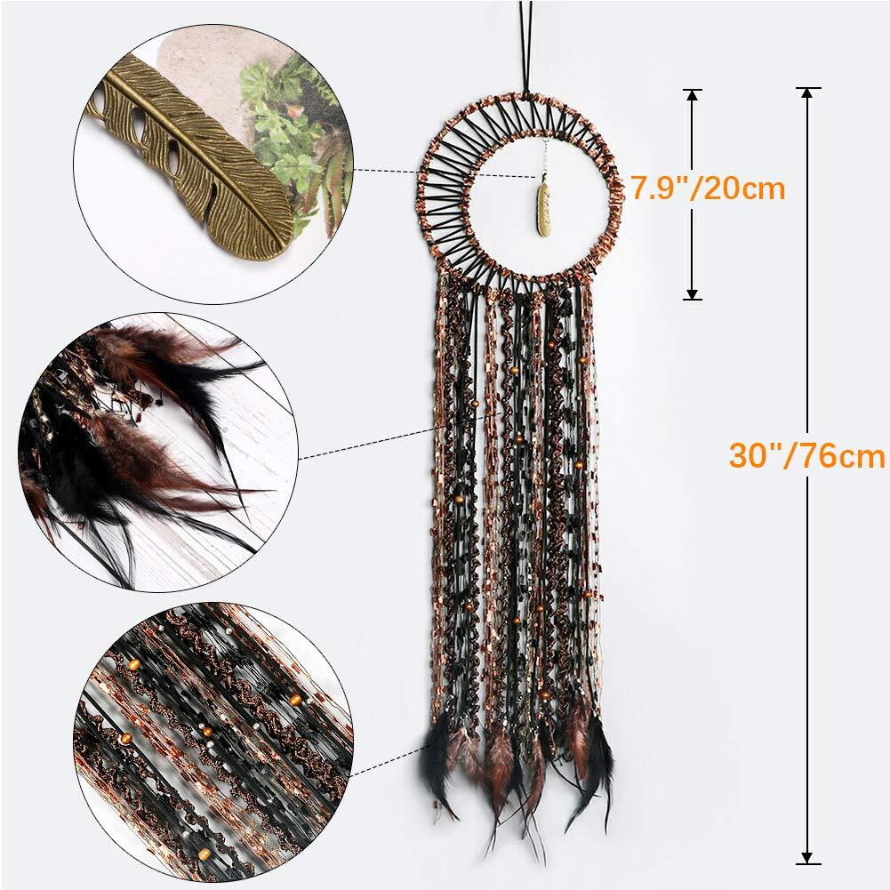 ღ Size: Diameter of Circle: 7.9"/ 20 cm; Length: 30"/ 76 cm. ღ Eco-friendly Material: Metal circle, Vintage gold feather pendant accessories, Brown traditional natural feathers, Wood beads, Cotton yarns. ღ Creative Gift: With 2019 newest fashion design and exquisite handmade crafts, this dream catcher with a retro feather pendant, great fit for kids bedroom, living room, baby nursery, dorm room, also as a best birthday/ holiday gift choice for your family, kids, parents, friends, even lovers. ღ Beautiful Decor: This dream catcher rich in boho chic style, will become an eye-catching wall hanging decoration in your room, and bring you a sense of peace and good dreams. ღ 100% Satisfaction Service: If you have any question about our product, please feel free to contact us. We will take full responsibility for the product quality and try our best to solve your problem quickly and efficiently.
