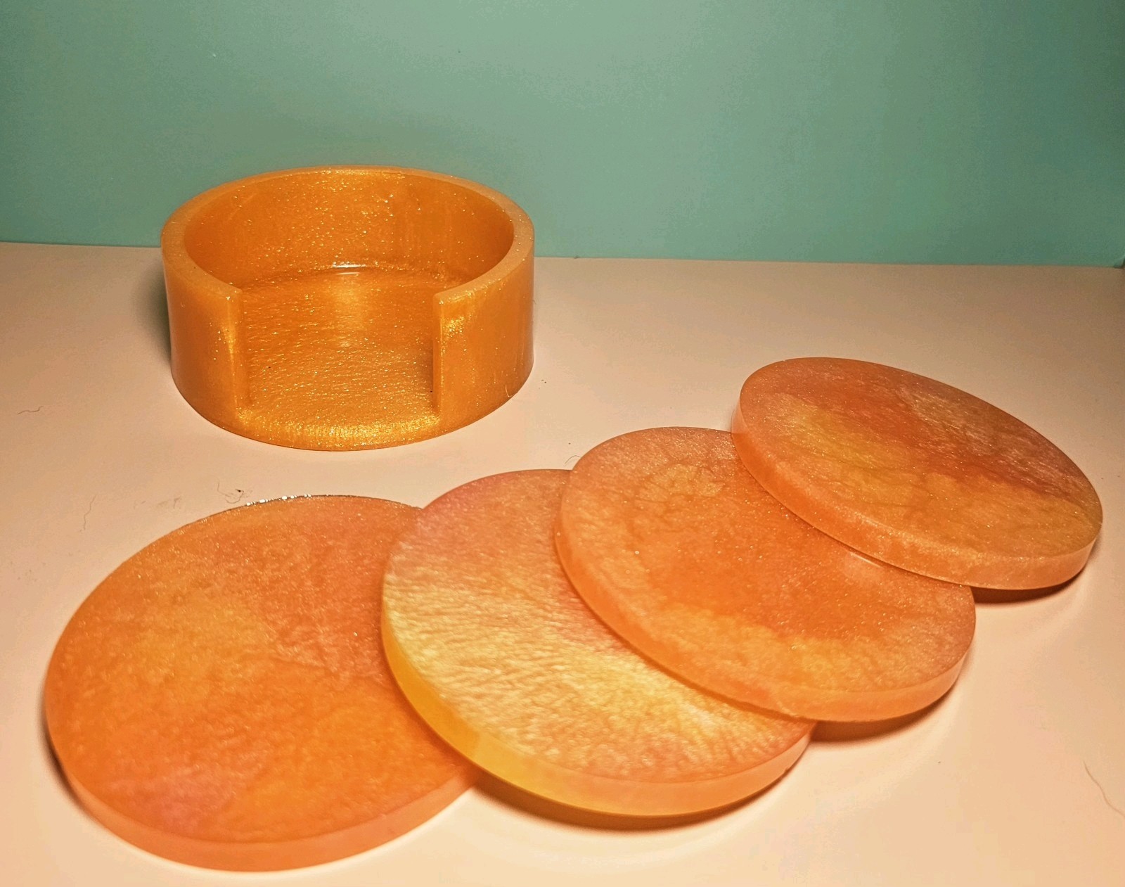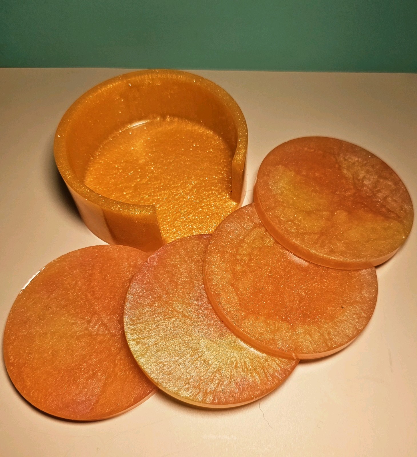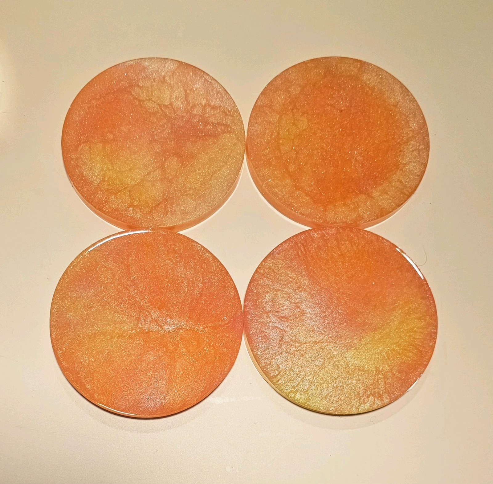 This handmade 5-piece coaster set features a marbled design in orange and yellow, perfect for all occasions. Made with durable Expy Resin material, these round coasters have a modern style and are lightweight, stackable, and should be hand washed only. With a diameter of 4 inches, these coasters are a stylish and practical addition to any kitchen, dining table, or bar area. Made in the United States, this coaster set is both personalized and unique, adding a touch of creativity to your decor.