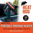 Heat Hog Piglet 4,000 BTU Indoor/Outdoor Portable Propane Heater The Heat Hog Piglet 4,000 BTU portable propane heater is a compact and efficient heating solution designed for both indoor and outdoor use. Whether you're in the garage, tailgating, ice fishing, hunting, camping, or simply need a quick heat source, this lightweight and portable heater delivers reliable warmth without requiring electricity. With a powerful 4,000 BTU output, this heater can effectively warm up to 100 square feet. Running on a 1lb propane cylinder, it provides up to 5.3 hours of continuous heat, making it an ideal choice for on-the-go warmth in any setting. (Propane tank not included.) The adjustable 45-degree tilt head allows you to direct heat exactly where you need it, ensuring maximum efficiency. A mountable base provides stability on rough terrain, making it a practical choice for outdoor adventures. Safety is a top priority with the Heat Hog Piglet. It includes a built-in safety tip-over switch, an Oxygen Depletion Sensor (ODS), and a rugged safety guard for added protection. The heater features a quiet piezo ignition system with a push-button start for effortless operation. Designed for convenience, this heater is light and easy to transport, featuring a heavy-duty carry handle. With its durable construction and user-friendly design, the Heat Hog Piglet is a reliable choice for staying warm in any environment.