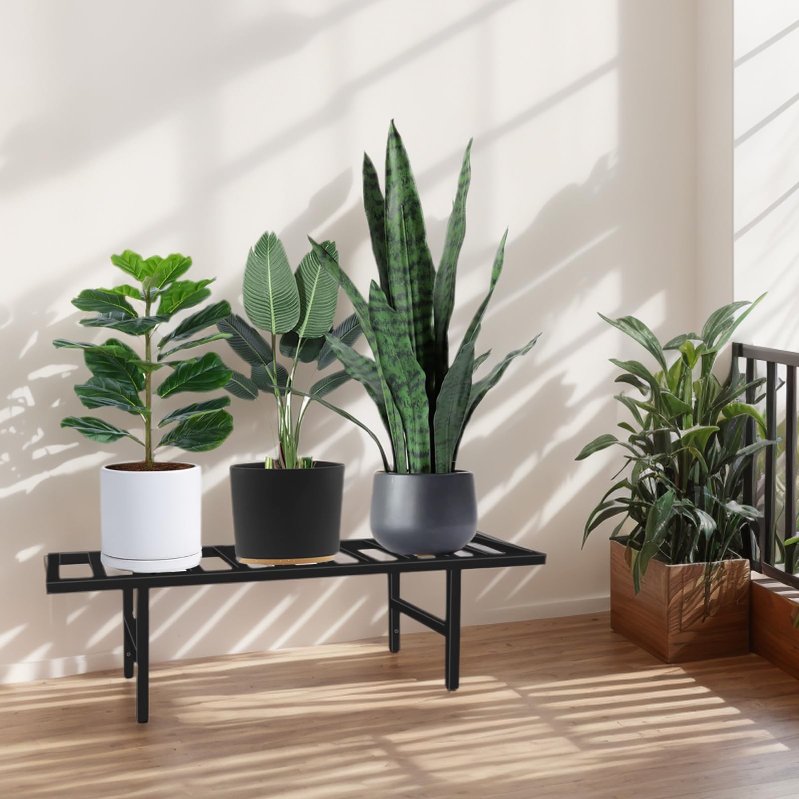 metal plant stand 【Sturdy All-Metal Construction】This Metal plant stand provides reliable support for your plants both indoor and outdoor. It's made of 0.8inch thick tube, not easily deformed, load capacity up to 100LB, Perfect for medium and small heavy-duty flower pots. 【Rust-proof & Sturdy】Our plant stand features a dual-layer waterproof and rust-proof process. The inner layer is galvanized, and the surface is coated with waterproof paint, providing better weather resistance and significantly extending its lifespan. Additionally, the short legs of the plant stand come with anti-slip pads to maintain balance and protect your floors from damage. 【Simple & Practical】This Outdoor Plant stand create a stunning display of your favorite plants and flowers in various settings. Whether in your living room, garden, patio, or balcony, this plant stand outdoor effortlessly complements any decor. 【Easy Installation and Space-Saving】The simple -step installation process is convenient and hassle-free. Our plant shelf will give your plants their own place -No matter how big or small your home is, there seems to be a proper corner to your baby plants. No need to worry about pets knocking them over 【Good Choice for Plant Lovers】Surprise plant and gardening enthusiasts with this practical and stylish plant stand indoor. Show-off your green plants and colorful flowers. The indoor plant stand features an elegant design and minimalist style, adding charm to your home and garden. Let your flowers bloom with this beautiful and practical flower stand, allowing you to enjoy their beauty at any time.