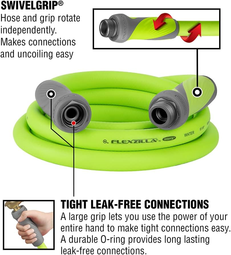 MALE & FEMALE SWIVELGRIP CONNECTIONS - Hose and grip rotate independently, makes connections and uncoiling easy, and naturally releases coils (SwivelGrip Patent Pending) EXTREMELY FLEXIBLE - All weather flexibility EXTREMELY DURABLE - Abrasion resistant outer cover and crush resistant anodized aircraft aluminum fittings HYBRID POLYMER - Won't kink under pressure, coils easily and lays flat with zero memory LIGHTWEIGHT - Lighter than traditional garden hoses making Flexzilla easier to carry and maneuver around the yard LEAK FREE CONNECTIONS AND DRINKING WATER SAFE - A durable O-ring provides long lasting leak free connections and feature an inner tube material that is drinking water safe Spray nozzle not included Color: ZillaGreen Premium Flexzilla SwivelGrip Garden Hose makes it easier to work around your home and lawn. SwivelGrip action eliminates twists that occur when uncoiling a hose. Conventional garden hose can trap coils that tighten into kinks as you move across the yard. SwivelGrip allows the hose and grip to rotate independently, releasing coils naturally, easily and effortlessly. The large, comfortable gripping surface on both ends of the hose lets you use the power of your entire hand to make tight connections easy. Flexzilla SwivelGrip Garden Hoses are engineered with a lightweight Flexible Hybrid Polymer which lays flat, eliminates kinking under pressure and is drinking water safe.