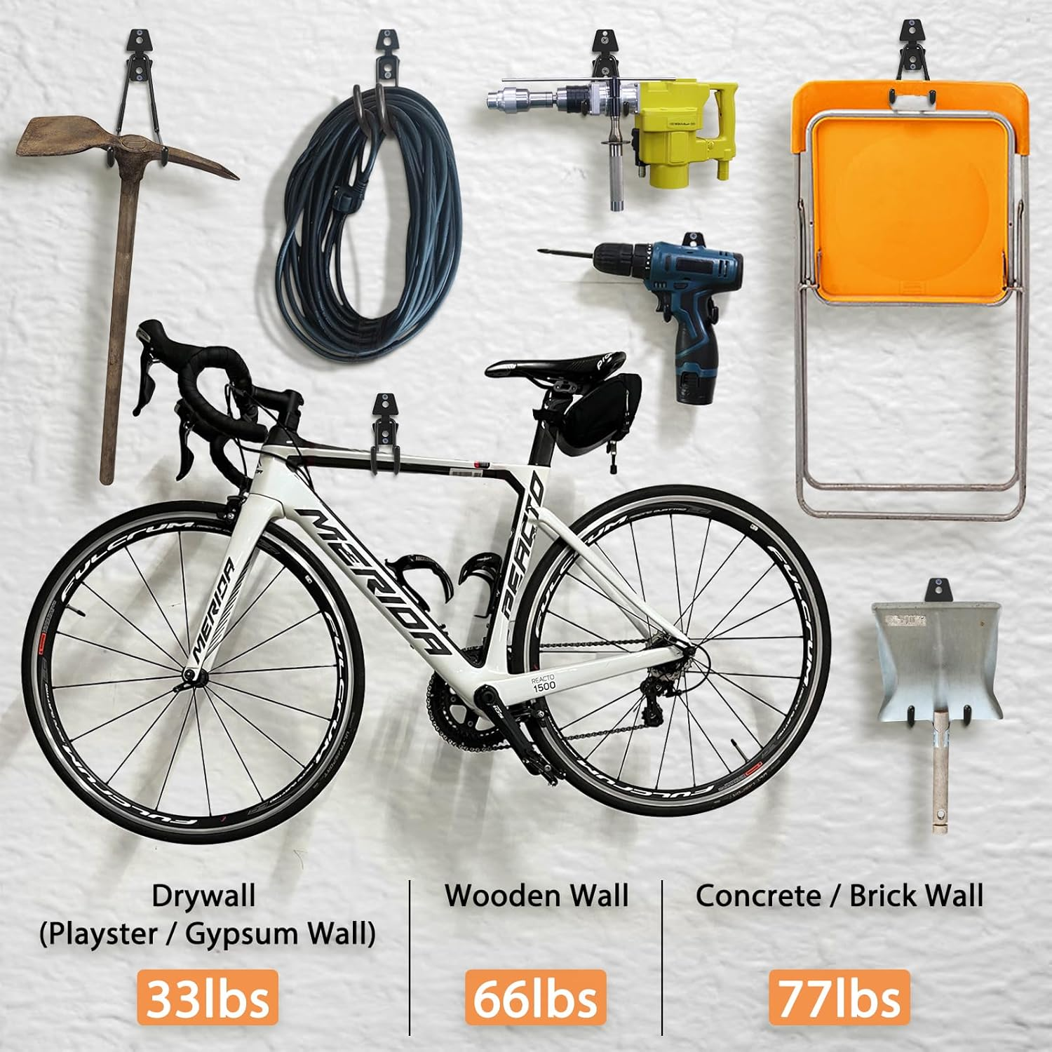Store New Arrivals Add to Favorite View Feedback Contact Garage Hooks for Hanging Heavy Duty, Embedded Welded Utility Hooks, 16 Pack Assorted Wall Racks, Storage Organizer Brackets for Shed Yard Tool Ladder Bike Hose Broom Mounting, with Screws and Anchors Description Item model number CC-GH-A01 Part Number CC-GH-A01 Item dimensions L x W x H 9.64 x 6.89 x 3.74 inches Finish Pvc,Steel Mounting Type Wall Mount Item Package Quantity 1 Special Feature Heavy Duty Material Steel, PVC Batteries Required? No Maximum Weight Recommendation 77 Pounds Item Weight 4.77 pounds Number of Hooks 16 Batteries Included? No Recommended Uses For Product Utility, Garage, Heavy Duty, Outdoor Surface Recommendation Plaster, Wood, Concrete, Brick Special Features Heavy Duty Finish Type Pvc,Steel Product Dimensions 9.64 x 6.89 x 3.74 inches Sturdy Storage Hooks: The tubular double hooks of 5.9mm steel with PVC coating include multiple sizes - Large L hook x 2, Medium L hook x 3, Small L hook x 5, Medium J hook x 2, Small J hook x 2, S hook x 2. Come with all the necessary hardware for mounting. Updated Construction: These wall hooks securely welded behind the mounting piece get structural integrity, protect hangers under external forces, and avoid accidental disconnection. Reliable for heavy-duty applications. Installation: These wall hangers work for plaster / wooden / concrete / brick walls. 33lbs for plaster wall, 66lbs for wooden wall, 77lbs for concrete and brick walls. You can use them on garages, sheds, basements, garden fences, pillars, and doors for indoor or outdoor tool organization. Solution for Big Heavy Items: These utility hangers are a must-have for your garage to save floor space. The assortment of hooks helps your hanging up different stuff on the wall, like bicycles, strollers, fishing rods, shovels, folding chairs, extension cords, hoses, power tools, and garden / sports equipment. Freely Wall Storage: Installation of hooks is independent so that you can design the distance between each other according to various sizes of objects and convenience attempts. LIGHT DUST provides different options for your multiple needs. Product Description Hooks for Hanging Heavy Duty Wall Hangers Bike Rack Garage Organization Tool Storage The garage ladder hooks create efficient storage space. Compared to single hooks, our wall hook has two holes that can easily hold weight and hang most items. These garage storage system hooks can be used as a garden lawn tool, ladder, hose storage rack organizer, and more. Flat Garage Wall Hooks Heavy Duty Garage Accessories Garage Tool Organizer Black Shelving Assortment Large L Hook Length of the short side: 6.5 inches Length of the long side: 7.3 inches Height: 6.3 inches Medium L Hook Length of the short side: 4.1 inches Length of the long side: 4.9 inches Height: 5.3 inches Small L Hook Length of the short side: 1.9 inches Length of the long side: 2.7 inches Height: 4.5 inches Curved Garage Hooks Ladder Hanger Tool Hook for Garage Wall Heavy Duty Garage Hooks for Hanging Medium J Hook Length of the short side: 3.3 inches Length of the long side: 3.9 inches Height: 5.7 inches Small J Hook Length of the short side: 2.1 inches Length of the long side: 2.5 inches Height: 4.7 inches S Hook Length of S Hook: 3.0 inches Height of S Hook: 4.7 inches Tool Organizers and Storage Utility Garage Wall Mount Hooks for Hanging Bike, Ladder and Garden Tools These utility hooks are a must-have for saving floor space in your garage. The garage hooks assortment helps you hang different things on the wall such as bikes, fishing rods, shovels, folding chairs, extension cords, hoses, power tools, ladders, lawn trimmers, gardening equipment, and garden/sports equipment. The garage wall hooks can be used anywhere you need them, such as garages, shops, sheds, gardens, warehouses, basements, and more. The LIGHT DUST garage hanging hooks keep everything organized and clear at a glance. ABOUT US We offer the best prices around on high quality products. Our E-store includes media such as books, movies, music and games while offering electronics, toys, sporting apparel, clothing, tools, general home, garden items and more. SHIPPING We are always working hard to ensure your package arrives as soon as possible. Please understand that some factors like weather, high postal traffic, and the performance of shipping companies are outside of our control. We offer free shipping to the lower 48 states and ship within 2 business days of payment, usually sooner. We do not accept P.O. Boxes. Please provide a physical address. For shipping outside of the continental USA, we only use eBay's Global Shipping Program.The item is shipped to KY and then sent to the rest of the world. International customers are responsible for all duties and taxes. Continue to check out in order to calculate costs for shipping the item to your country. Messages regarding eBay's Global Shipping Program MUST be directed at eBay EXCLUSIVELY. RETURNS We offer a 30-Day Return Policy on items which you are not completely satisfied with. You have the option for a full-refund or an exchange of the item. No returns are available on items shipped outside of the USA. PAYMENT We accept PayPal. CONTACT US This page content is yet to come Please ad us to your favorite seller and visit again later Thank You CUSTOMER SATISFACTION We try our very best to make sure every customer is completely satisfied. If there's a problem, message us! We're happy to help. WE ACCEPT Copyright © 2021 AutoDS. | All Rights Reserved