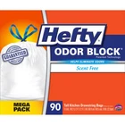 Hefty Odor Block Tall Kitchen Trash Bags - 90 Count Garbage disposal is a cinch with Hefty unscented drawstring trash bags. The convenient drawstring closure makes it easy to wrap and carry your trash while the scent-free Odor Block technology helps your kitchen smell fresh. Product Details Brand Hefty Size 90 Count (Pack of 1) Style Scent Free Product Type Trash Bags Mpn 31612 13-gallon Tall Kitchen Drawstring Trash Bags^Helps eliminate odors with patented dual-action odor control technology^Available in 4 fragrance varieties: Scent Free, Lavender Vanilla, Clean Citrus or Clean Apple^Every carton features one Box Tops for Education coupon. Hefty has contributed over $3.5 Million to schools through the Box Tops program.^100% Money Back Guarantee Tall kitchen trash bags 90 count friom Hefty that delivers strength and convenience you can count on Keep your garbage in the dark Odor Block technology - Powered by