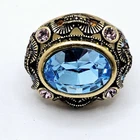Heidi Daus Ring features beautiful Bluecrystal in the center. The ring is made of high-quality materials and is a size 7 Perfect for any occasion, this ring is sure to catch the eye and make a big bold statement. The brand, Heidi Daus Designer is known for unique and stylish designs, making this ring a must-have for any fashion jewelry collection. Very NICE Pre-owned condition Sz. 7