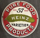 This Heinz Pure Food Products porcelain sign features the Ande Rooney brand and is a perfect addition to any collection. Measuring 11.25 inches, this multi-colored sign is a reproduction of the original and is made in the United States. It is a great piece of advertising memorabilia that would make a wonderful gift for any collector.