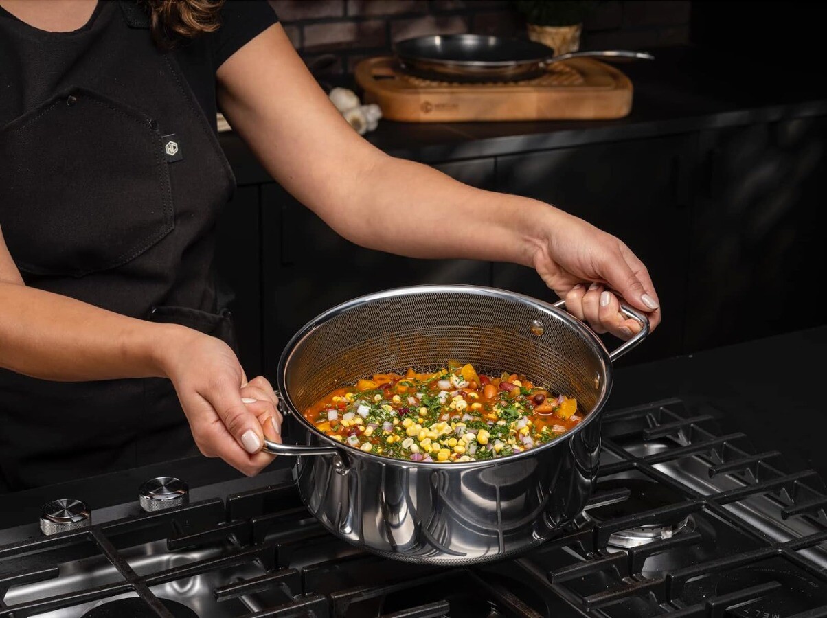 Package: 1X HexClad Hybrid Nonstick 5-Quart Dutch Oven with Stainless Steel Lid, Stay-Cool Handles, Dishwasher-Friendly, Oven-Safe Up to 900°F, Induction-Ready, Compatible with All Cooktops Description: HexClad's patented hybrid tech utilizes tri-ply construction – aluminum between two layers of stainless-steel - laser-etched with our hexagonal nonstick surface to deliver the searing power of stainless, durability of cast-iron and easy cleanup of nonstick. Half the weight of traditional enamel-coated cast-iron pots, our Hybrid 5-quart Dutch Oven is a champion at searing proteins on the stovetop and then slow braising them in the oven. Also perfect for slow-cooked stews, soups and breads. Use your HexClad cookware on any home cooktop or stovetop, including induction. Every piece is also scratch-resistant, dishwasher-friendly, and oven-safe up to 900°F. (Tempered glass lids are oven-safe up to 400°F, while stainless steel lids are oven-safe up to 900°F.) HexClad products that are sold by HexClad Cookware are backed by a lifetime warranty from manufacturer's defects. (Commercial and restaurant use excluded). Your purchase includes one HexClad 5-quart Dutch Oven and one Steel Lid. The 5-quart Dutch Oven measures approximately 10 inches in diameter, 2.5 inches in height, and 3 pounds in weight.