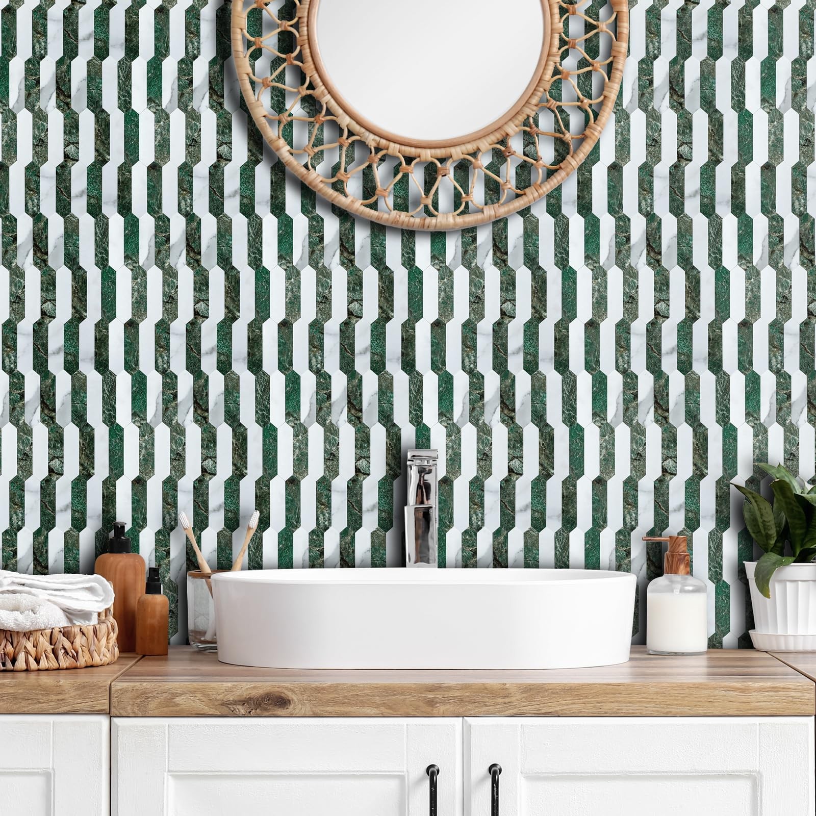 peel and stick tile backsplash are flexible and smart. Just peel and stick, no grout and contractor required, adapted to instant renovation and decoration. Peel and stick kitchen backsplash not suitable for Latex painted wall ,Repainted wall , Falling Ash wall !!! Kitchen backsplash made of anluminun composite panel and with Stronger backing adhesive backing than ordinary vinyl backsplash tile, stick firmly to the smooth & clean surface. The green marble look tiles are versatile and paired with today's popular furniture. Perfectly decorated in Kitchen island walls, bedroom walls backsplash, laundry room, Washbasin etc. Self-Adhesive Kitchen Backsplash colors never change over time, and easy wipe to remove the stain, don'