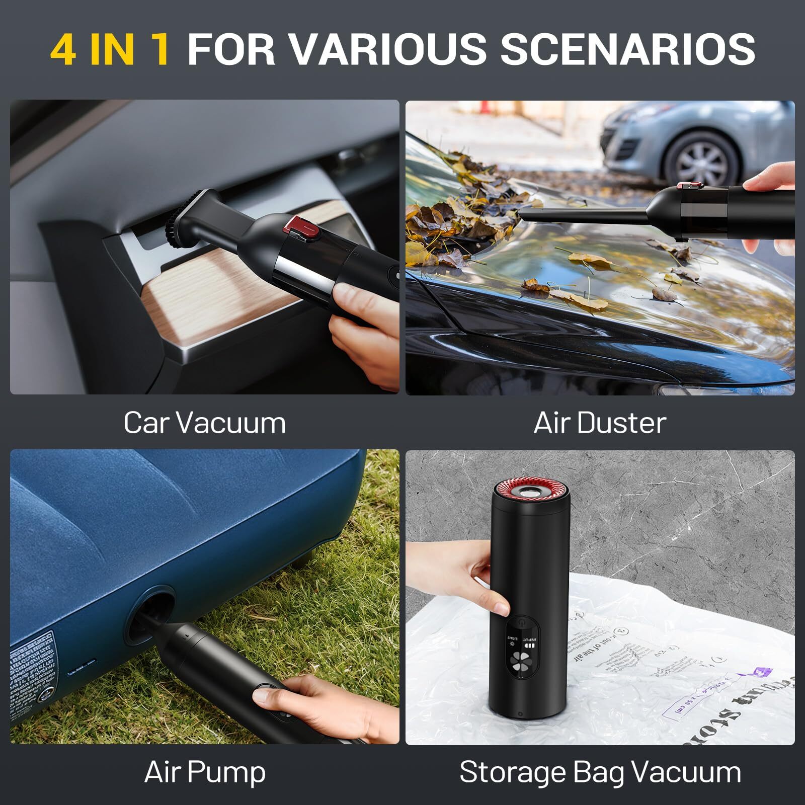 15000Pa MEGA SUCTION FORCE CAR VACUUM - 80000rpm brushless motor provides strong suction of Max 15kPa to easily pick up stubborn sand, dust and debris. Upgraded drive system output high-speed constant airflow, making the car vacuum high power always at peak suction power. suction modes, Eco Mode can be used for 32 minutes, Max Mode can be used for 19 minutes. Ideal for car detailing, home cleaning and outdoor camping use 4-IN-1 SMALL VACUUM WITH MULTI-PURPOSE USE - It’s a vacuum cleaner, an air pump, an inflator and a blower in design. Come with 4 universal nozzles, suitable for most small-large sized inflatable products, such as air mattresses, inflatable beds, pool floats, sleeping pads, swim rings, inflatable furniture, pool inflatables and other inflatable toys ULTRA-LIGHT & WIRELESS MINI VACUUM - Only at 0.88lbs (396g) that a bottle of water weighs, offers portable vacuum a comfortable grip and easier operation, long-time using without soreness, no longer bound by the power outlet, allows you to easily handle sand, dust, and debris in every corner of the car with hand CONVENIENT TRASH EMPTYING VACUUM CLEANER - -touch to empty, a single touch pops open the lid automatically, emptying debris without getting your hands dirty. The ring latch on the vacuum for car is designed to prevent accidental touch. The HEPA filter captures a whopping 95.99% of dust and particles, providing more efficient cleaning performance and longer service life FAST CHARGING - With a universal type-c charging cable, the handheld vacuum cordless can be fully charged within 2.5 hours. Charge it in the car or charge with standard chargers, computers, power banks, or various storage devices, allowing you charge anywhere, anytime