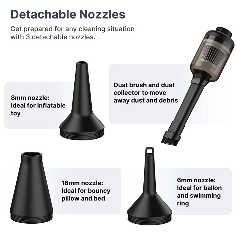 The Electric Air Duster Kit is the perfect companion for the Powerful Electric Air Duster . It includes 5 essential accessories: a dust brush, dust collector, 6mm nozzle, 8mm nozzle, and 16mm nozzle. This kit is ideal for cleaning cameras, computer keyboards, pet houses, car interiors, window tracks, and more. Specifications: Dust Collector Dimensions: Φ53.2*112mm Net Weight: 55.8g Dust Brush Dimensions: 31.5*26.2*140.2mm Net Weight: 17.9g 6mm Nozzle Dimensions: 6.6*33.6*55.3mm Net Weight: 3.5g 8mm Nozzle: Dimensions: 8.2*33.8*55.1mm Net Weight: 3.9g 16mm Nozzle: Dimensions:16.7*33.6*51.1mm Net Weight: 6.2g