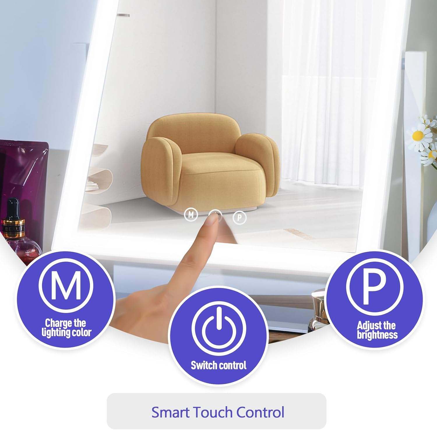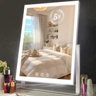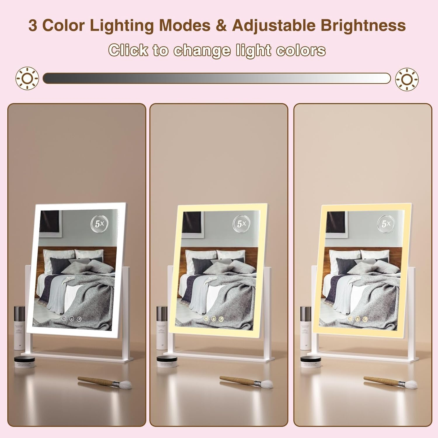 96 LED Lights Vanity mirror:The makeup mirror (13.5" L x 17.5" H ) allow you to get your entire face in view at once. 96 LED lights along four sides of mirror will offer ideal lighting for applying makeup. With a 5x magnification mirror you can see the details of your face, ensure you get a flawless makeup application every time. 3 Color Light Modes: Day light(5500K), Cold light(7800K), Warm light(4000K). Just tap the smart touch button to switch light mode that you need. 360° Rotatable: Find the perfect angle for makeup with 360-degree rotation mirror and can be secured in any desired position.It is more energy-efficient, brighter, and long-lasting enough to make perfect makeup. with a Type-C cable(with adaptor) Smart Control:The brightness can be adjusted by holding down the P button, while the M button is used to change the lighting color. The brightness can also be adjusted to your desired level, allowing you to apply makeup or do your skincare routine with ease, regardless of the lighting conditions in your room. Best Gift for Women:Enhance your daily makeup routine with our Lighted Makeup Mirror. Light up mirror is exquisite, compact, elegant and beautiful and can be given as a gift to your family, friends and loved ones on any holiday. Product Description The video showcases the product in use. The video guides you through product setup. The video compares multiple products. The video shows the product being unpacked. 3 Color Lighting Modes Solid Metal Frame 360° Free rotation Mirror 5X Magnifying Mirror