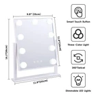 Perfect Size: The makeup mirror (11.8" L x 10" H) allow you to get your entire face in view at once. Large tabletop mirror is large enough to be used for makeup, grooming and even dressing. 360 degree free rotation can be fixed in any position, providing you with a perfect perspective. Natural & Bright Lighting: Lighted makeup mirror surrounded by 9pc LED bulbs with day light / cool light / warm light settings, adjustable brightness is meet to your personal makeup requriement. Smart Touch Control & Memory Function: Simply turn on/off the vanity mirror with lights, touch the sensor switch on the screen to adjust the brightness. Memory function makes this lighted vanity makeup mirror with light return to the same brightness it was on before being switched off. Metal Frame & High Quality LED Bulbs: The Tabletop Mirror with light Made of top materials, sturdy and durable. The pre-installed LED bulb has a life span of up to 50,000 hours, soft light protect your eyes. Perfect Vanity Mirror: The Hollywood Makeup Mirrors with Lights can add elegant decoration to your bedroom and dressing table area. Make it the best gift for makeup lovers. Product Description