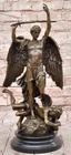 Hot Cast Archangel St Saint Michael w/ Shield Sword Color Bronze Figurine Gift Hot Cast Archangel St Saint Michael w/ Shield Sword Color Bronze Figurine Gift Condition : This sculpture is in perfect condition Bronze Dimensions with Marble Base: Height 15.5" X Width 8" Marble Dimensions: Diameter 6" Height without base:14" Weight:14 LBS Inventory:68Y4628286 Mythical Majesty in Bronze: St. Michael Slaying the Dragon This striking bronze sculpture vividly depicts a mythical figure with a dragon's tail, large wings, and a sword, standing tall with one finger raised in the air. The larger figure, exuding an imposing presence, towers over a smaller winged man who appears both frightened and awestruck, seemingly being stepped over by the dominant figure. The interpretation of this dramatic scene is left to the viewer's imagination – does this figure represent good or evil? The powerful stance and fierce appearance certainly suggest a commanding and formidable presence. Craftsmanship and Symbolism Crafted from 100% solid bronze, this sculpture captures the essence of mythological storytelling and artistic mastery. The intricate details of the figures, from the texture of the wings to the tension in their poses, highlight the artist's skill and attention to detail. The larger figure's dominating posture over the smaller winged man evokes a sense of power and conflict, inviting viewers to ponder the underlying narrative. A Statement Piece for Any Space Mounted on a black marble base, the sculpture gains a sense of weight and importance, enhancing its overall impact. Whether you are an art collector, a mythology enthusiast, or simply someone who appreciates the beauty and craftsmanship of bronze sculptures, this piece is sure to impress. It stands as a stunning work of art that adds character and depth to any space it occupies, making it a focal point and conversation starter. Signed Carpeaux Good Vs Evil Angel Striking Devil Bronze Marble Sculpture Statue www.bronzhaus.com Video will open in a new window Using the eBay App? Paste link into a browser window: [isdntekvideo] Shipping Terms : Most of our items are shipped via USPS (United States Postal Service) mail or UPS. Most orders are shipped within 24-48 hours of purchase. Please be aware that not all items are available for USPS shipping due to size and weight. We do ship to Hawaii, Alaska, Canada, Puerto Rico, APO/AE, and U.S. Virgin Islands, however, an additional charge may be required. Please contact us before making any purchases in these areas. For Non-USA customers, you may be responsible for all duty, tax, brokerage fees that may be due upon delivery (shipping costs cover freight charges only). We also ship internationally. Please refer to the "Shipping and Handling" chart for the rates for each area. Payment : We accept just about any form of payment. PayPal, Master Card, Visa or American Express credit cards. Money orders, cashiers checks, and even personal or business checks. For governmental institutions, we will also accept a purchase order. Please understand that for personal or business checks we have to wait for the check to clear (usually 7 days) before shipping. Condition : New Detailed Hand Crafted Hot Cast Bronze Satisfaction Guaranteed. This is Stock Photo, Slight Color Variation!! Listing and template services provided by inkFrog