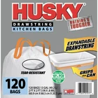 About this item Tall Kitchen Bags 120 count Fits most standard sized kitchen trash cans Easy-to-use Unscented Expandable drawstring One-by-One dispensing Volume Capacity 13 gal Bag Closure Drawstring Scent Unscented Recommended Use Household Recommended Room Kitchen Brand Husky Manufacturer Part Number HKR13XDS120W Color White Manufacturer Poly-america Assembled Product Dimensions (L x W x H) 4.50 x 8.87 x 9.12 Inches