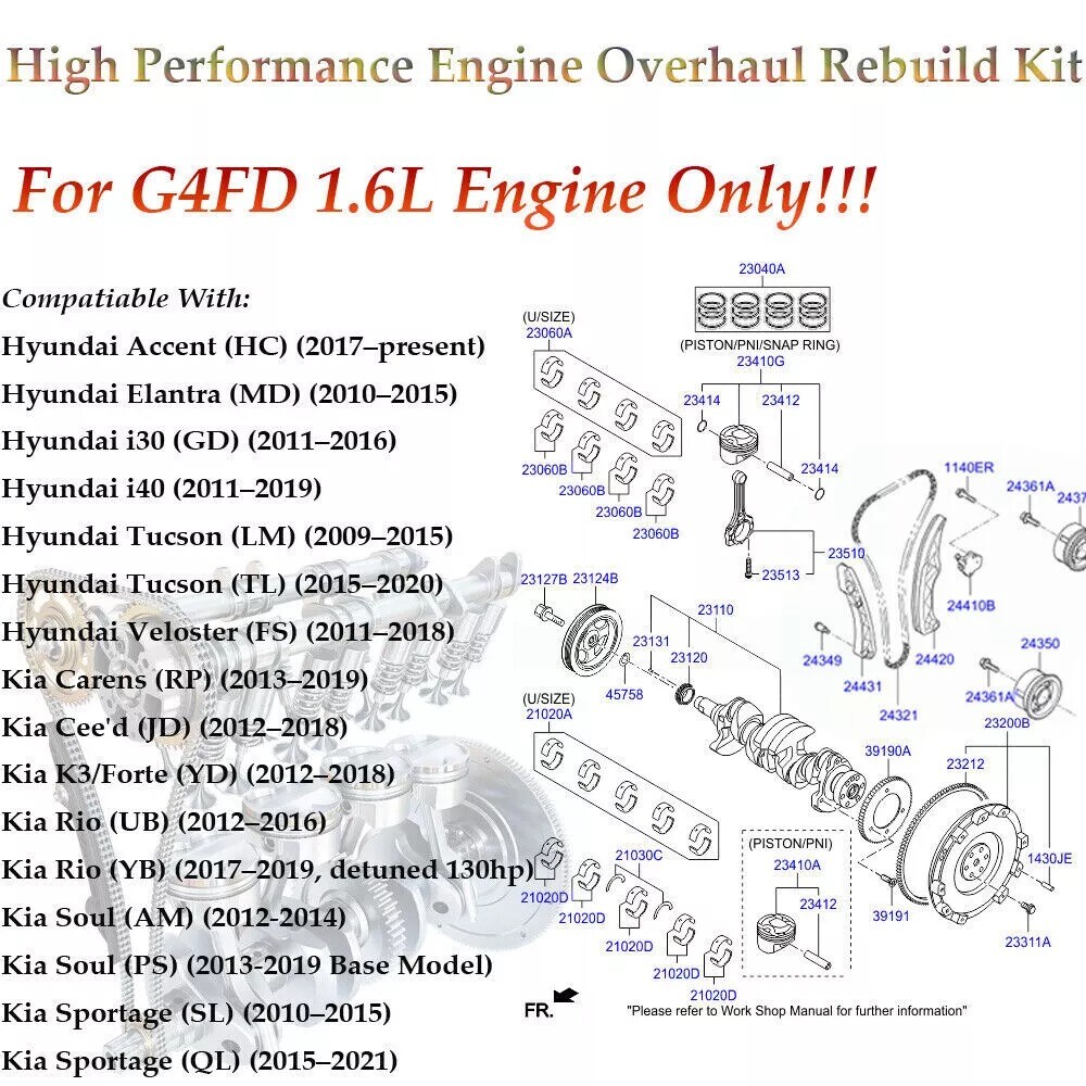 This G4FD 1.6L rebuild kit is a game-changer for Hyundai and Kia owners! It includes everything you need—timing kit, con rods, gaskets, and more—all high-quality OEM-spec parts. Installation was smooth, and the detailed guide made the process hassle-free. Perfect for a full engine overhaul, it restored my car’s performance like new. Highly recommend for a reliable, cost-effective rebuild!