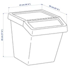 SORTERA Waste Sorting Bin With Lid Secondary Foldable Storage Box White 60 L This durable, plastic storage bin has a foldable lid that makes it easy to open even if you have another bin stacked on top. Use several boxes for sorting different types waste - or laundry. Product details: You can easily access the contents of a bin, even when stacked, because it has a folding lid. Designer: IKEA of Sweden Good to know: Suitable for waste sorting of glass, metal, plastic, newspapers, etc. Not suitable for outdoor use. Product is possible to recycle or use for energy recovery, if available in your community. Materials & care: Material Polypropylene plastic (min. 20% recycled) Care Wipe clean with a soft cloth dampened in water and a mild washing-up detergent or soap, if necessary. Measurements: Width: 41 cm Depth: 55 cm Height: 45 cm Volume: 60 l