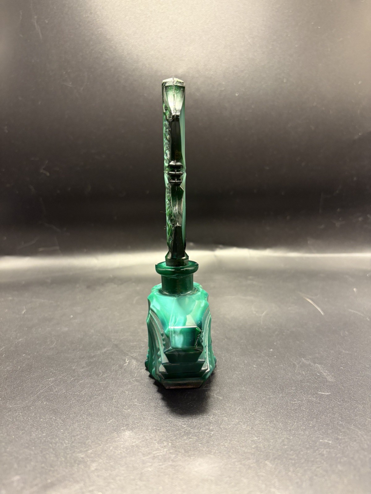 The product is a handmade Ingrid Schlevogt Czechoslovakia Art Deco malachite perfume bottle with stopper, originating from Czechia. Known for its unique design and craftsmanship, this perfume bottle stands out as a luxurious and stylish addition to any collection. The use of malachite adds a touch of elegance and exclusivity to the piece, making it a sought-after item for those who appreciate fine artistry and quality craftsmanship.
