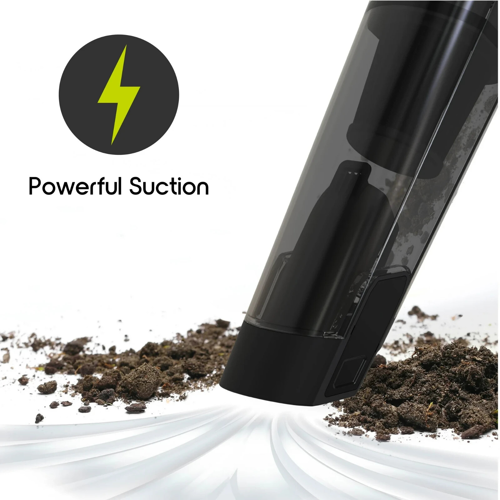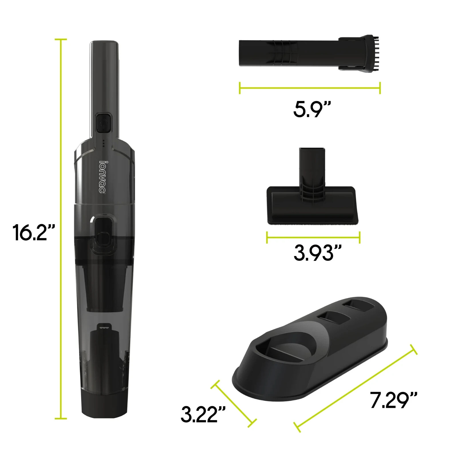 Keep your home and car mess-free with the IonVac PowerMax Hand Mini Vacuum! This handheld, cordless mini vacuum cleaner boasts a powerful suction that picks up even the toughest dust, dirt, and debris from the smallest crevices on any kind of surface. It comes equipped with a crevice nozzle with a dust brush, specifically designed to help you clean all those tight corners and hard-to-reach places, as well as a flat upholstery nozzle to vacuum sofas, pillows, curtains, and other delicate surfaces. Also included is a storage tray for easy organization. Lightweight and compactly designed, and featuring 5k Pa of suction power, a large 150ml capacity dustbin, and a long-lasting Li-Ion rechargeable battery, this ultra-portable cordless handheld vacuum is perfect for cleaning small messes at home, in your car, or while traveling. The IonVac PowerMax is here to make cleaning a breeze! Lightweight and cordless mini vacuum cleaner with 5kPa of suction power Two power modes with LED light indicators Crevice nozzle with dust brush for cleaning corners; upholstery nozzle for sofas and delicate materials Up to 30 minutes of use on a single charge with battery indicator lights 150mL dustbin capacity Storage tray for easy, space-saving organization USB-C rechargeable Perfect for home and office maintenance, auto detailing, and as a pet vacuum Includes USB charging cable, storage tray, crevice nozzle, upholstery nozzle, and HEPA filter Specs: Input - 5V/2A; Power - 75W; Battery - 2800mAh; Charge Time - 3-4 hours